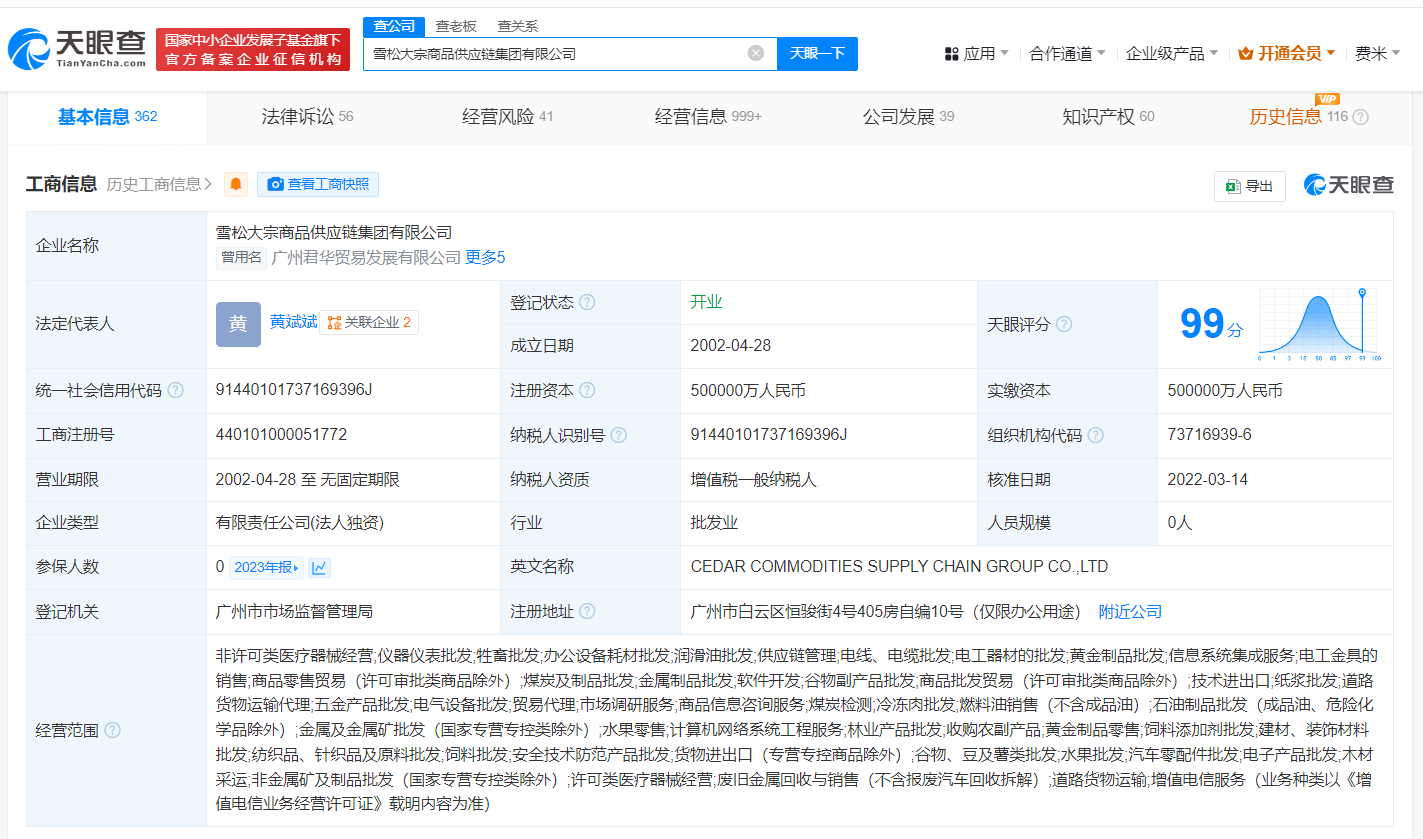 雪松大宗商品供应链集团有限公司成立于2002年4月,法定代表人为黄斌斌,注册资本50亿人民币,经营范围含商品零售贸易、货物进出口、贸易代理、商品信息咨询服务等,由雪松实业集团有限公司全资持股。