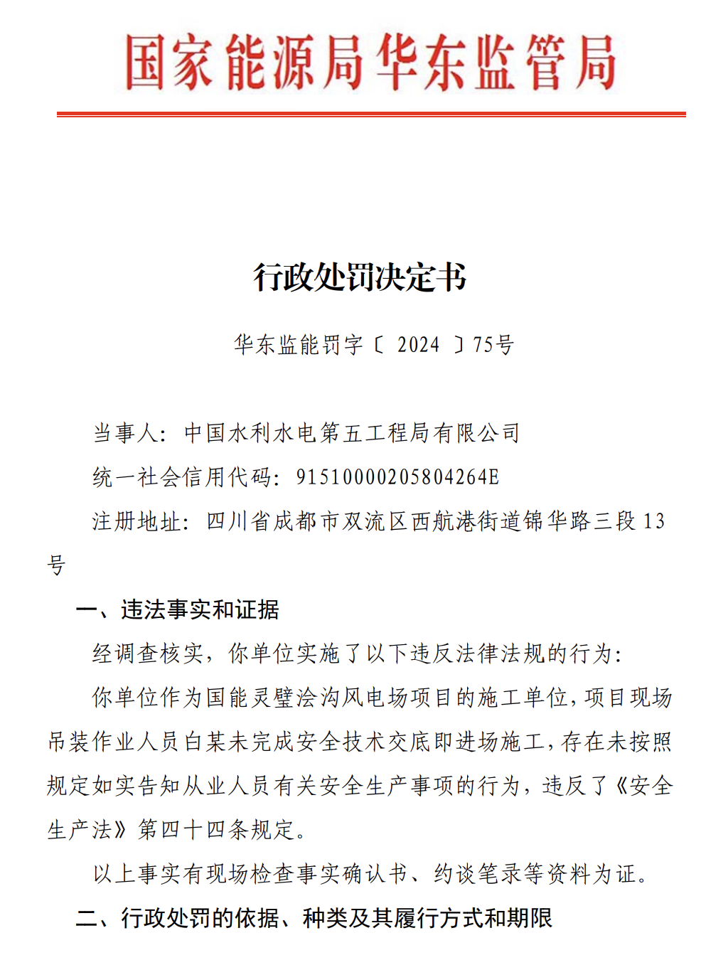 11月6日,国家能源局华东监管局发布华东监能罚字【2024】75号文件,对中国水利发电第五工程局有限公司违反法律法规的行为进行处罚。