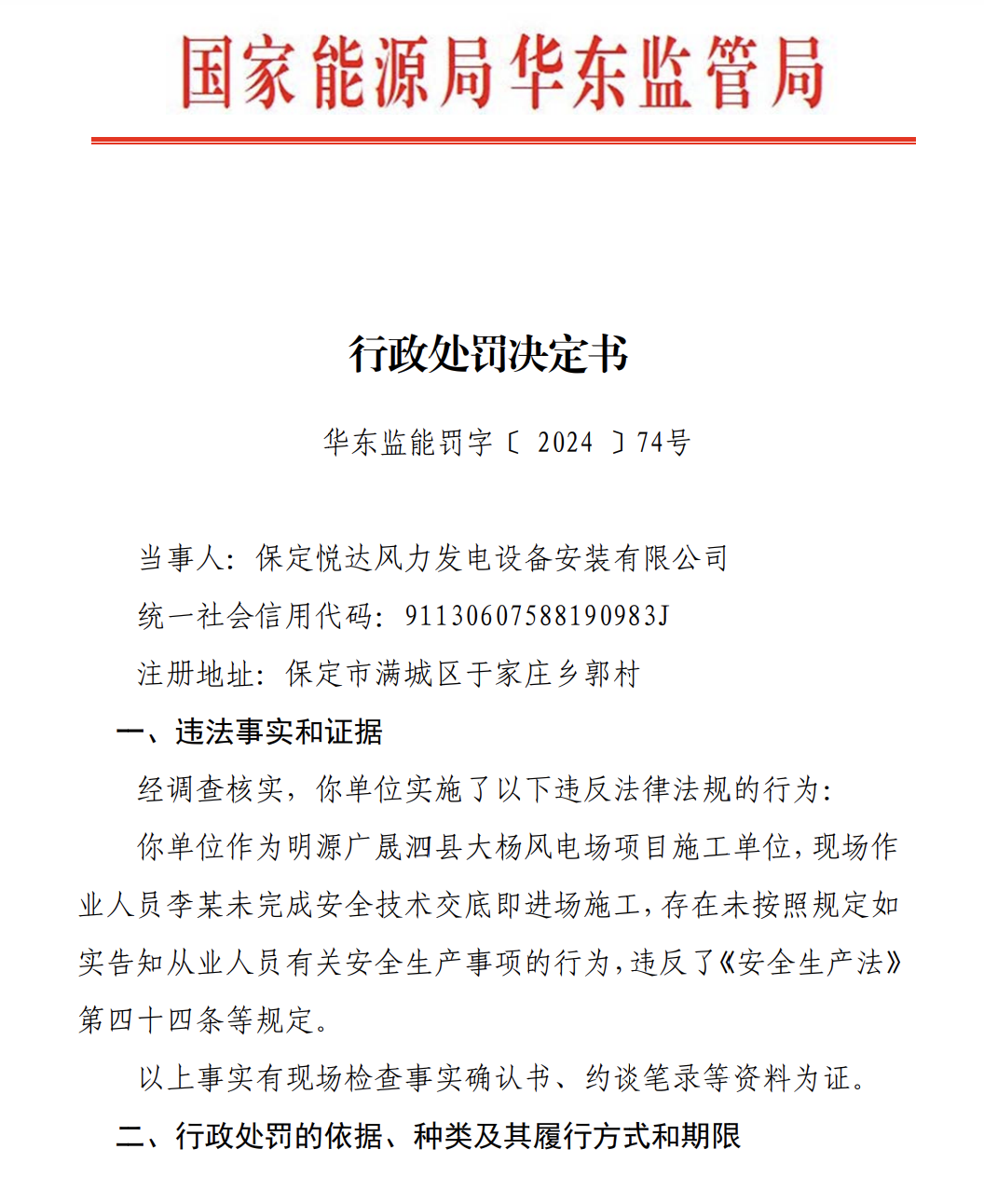 11月6日,国家能源局华东监管局发布华东监能罚字【2024】74号文件,对保定悦达风力发电设备安装有限公司违反法律法规的行为进行处罚。