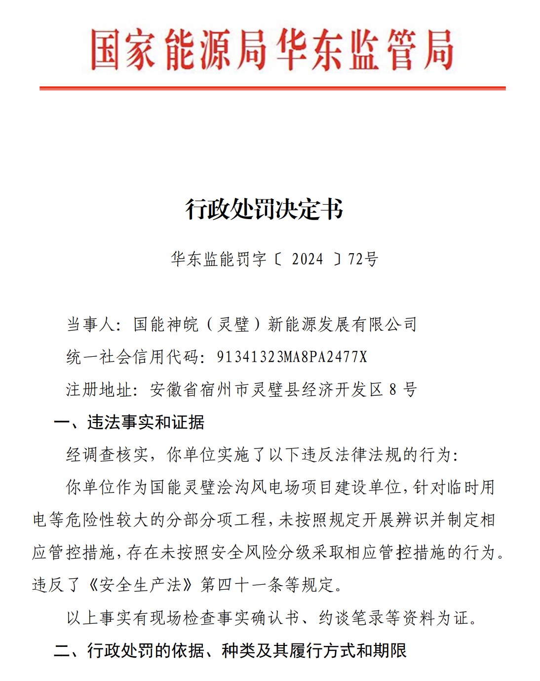 11月6日,国家能源局华东监管局发布华东监能罚字【2024】72号文件,对国能神皖(灵璧)新能源发展有限公司违反法律法规的行为进行处罚。