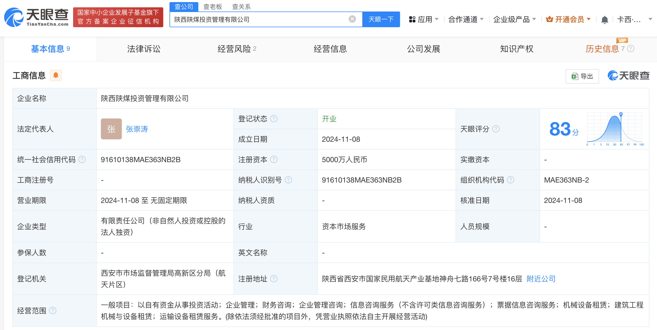 天眼查App显示,近日,陕西陕煤投资管理有限公司成立,法定代表人为张崇涛,注册资本5000万人民币,经营范围含以自有资金从事投资活动、企业管理、财务咨询、企业管理咨询等。股东信息显示,该公司由陕西煤业化工集团有限责任公司全资持股。