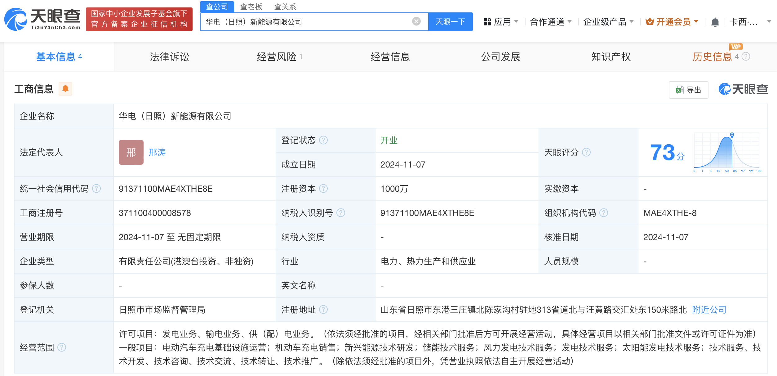 天眼查App显示,近日,华电(日照)新能源有限公司成立,法定代表人为邢涛,注册资本1000万人民币,经营范围含电动汽车充电基础设施运营、机动车充电销售、新兴能源技术研发等。股东信息显示,该公司由华电新能源集团股份有限公司、华电新能源集团国际投资有限公司分别持股80%、20%。