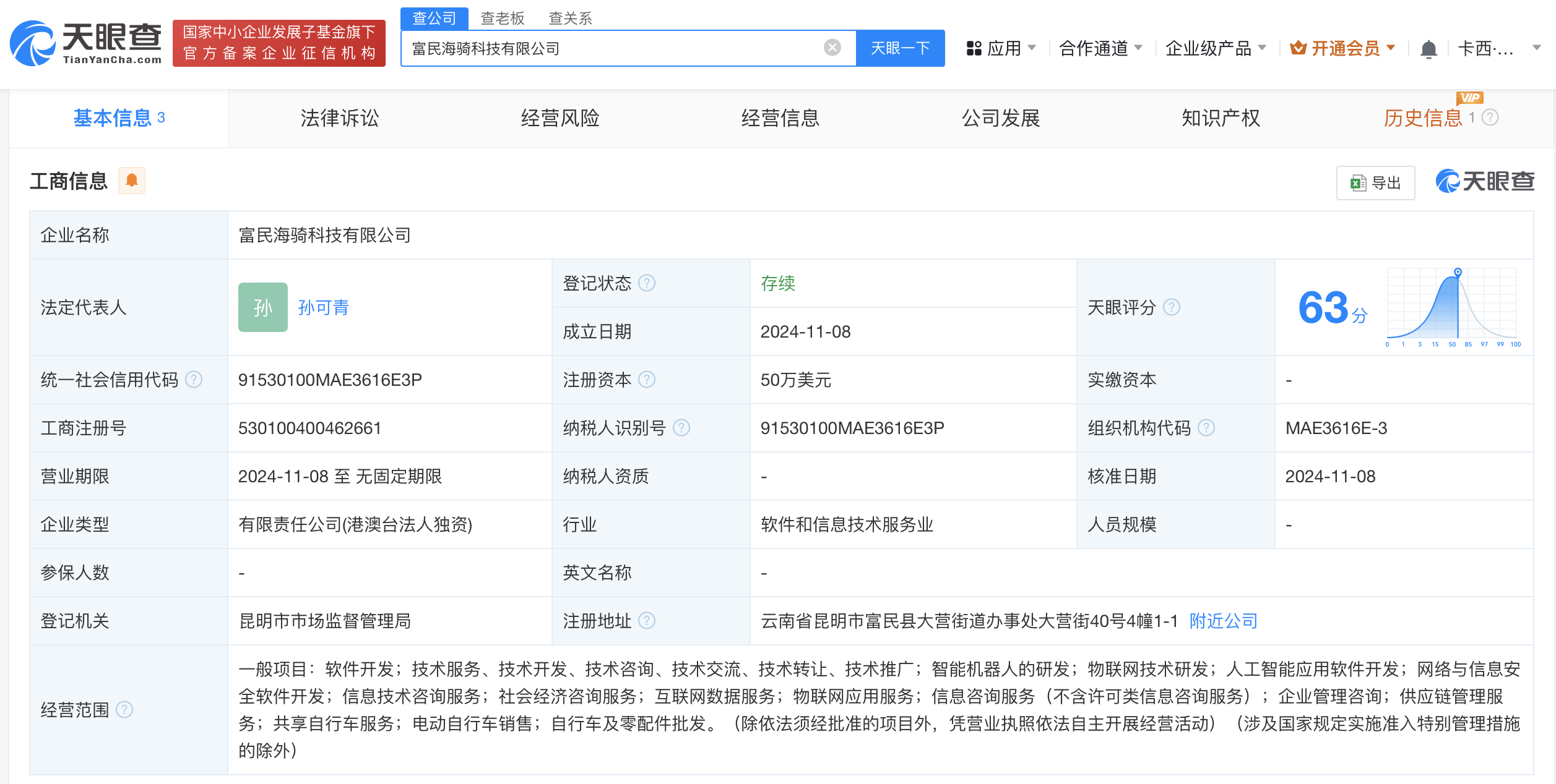 天眼查App显示,近日,富民海骑科技有限公司成立,法定代表人为孙可青,注册资本50万美元,经营范围含智能机器人的研发、物联网技术研发、人工智能应用软件开发、共享自行车服务等。股东信息显示,该公司由美团旗下Xigua Limited全资持股。