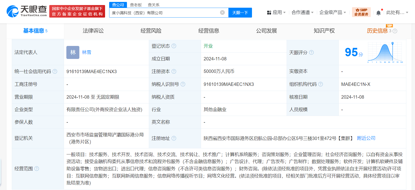 天眼查App显示,近日,度小满科技(西安)有限公司成立,法定代表人为林雪,注册资本5亿人民币,经营范围含计算机系统服务、企业管理咨询、以自有资金从事投资活动、接受金融机构委托从事信息技术和流程外包服务、信息咨询服务、财务咨询、互联网新闻信息服务、网络文化经营等。股东信息显示,该公司由度小满关联公司度小满科技(北京)有限公司全资持股。