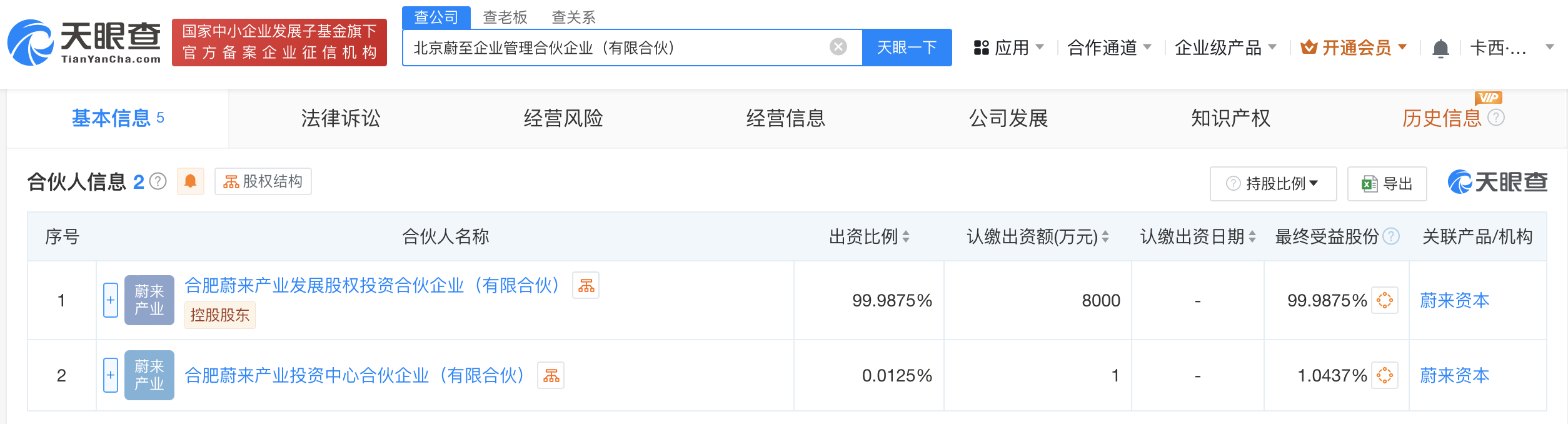天眼查App显示,近日,北京蔚至企业管理合伙企业(有限合伙)成立,执行事务合伙人为蔚来资本旗下合肥蔚来产业投资中心合伙企业(有限合伙),出资额8001万人民币,经营范围为企业管理。合伙人信息显示,该企业由合肥蔚来产业发展股权投资合伙企业(有限合伙)、合肥蔚来产业投资中心合伙企业(有限合伙)共同出资。
