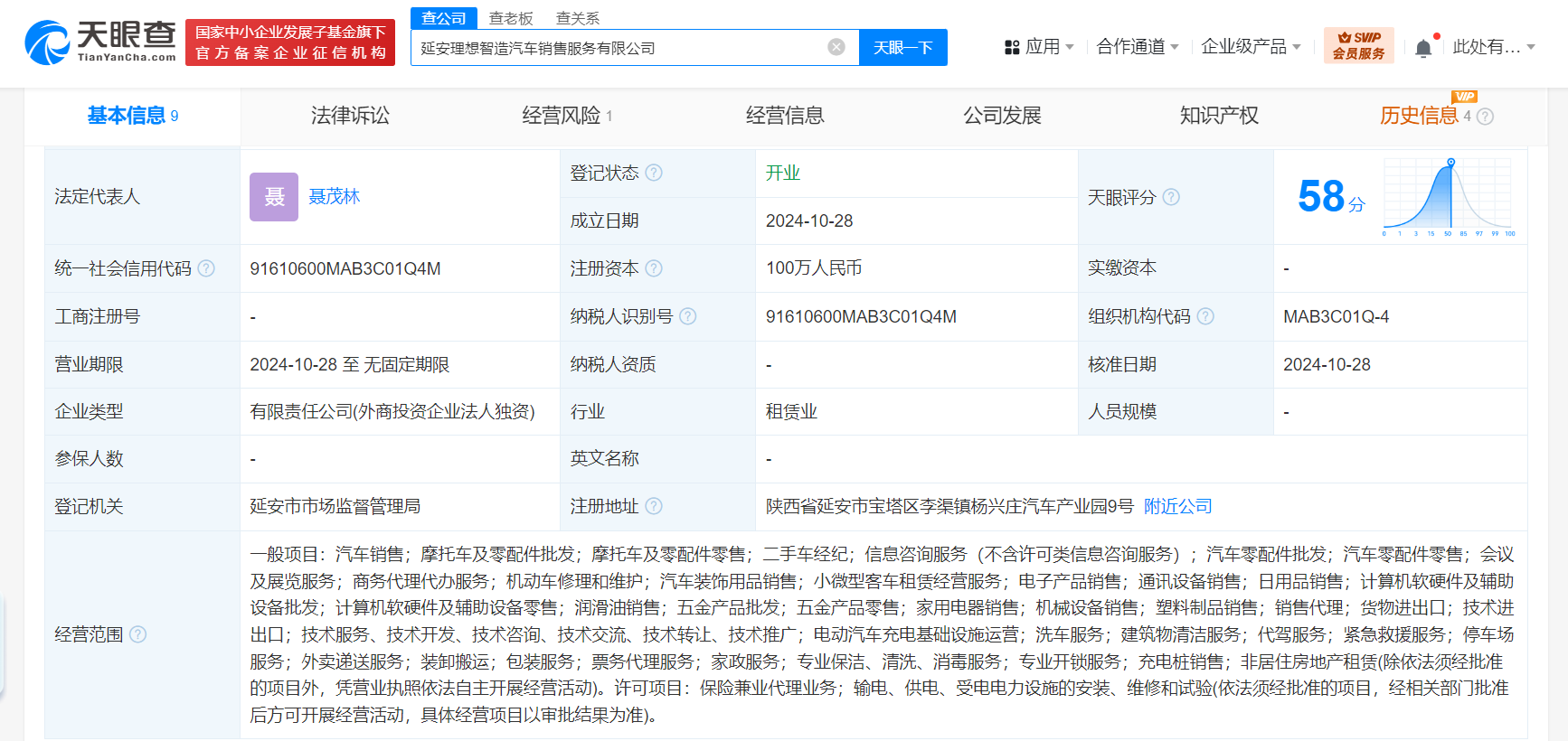 天眼查App显示,近日,延安理想智造汽车销售服务有限公司成立,法定代表人为聂茂林,注册资本100万人民币,经营范围含汽车销售、二手车经纪、信息咨询服务、汽车零配件零售、电动汽车充电基础设施运营、代驾服务、票务代理服务、充电桩销售等。股权全景穿透图显示,该公司由北京励鼎汽车销售有限公司全资持股,后者为理想汽车旗下Leading Ideal HK Limited全资子公司。