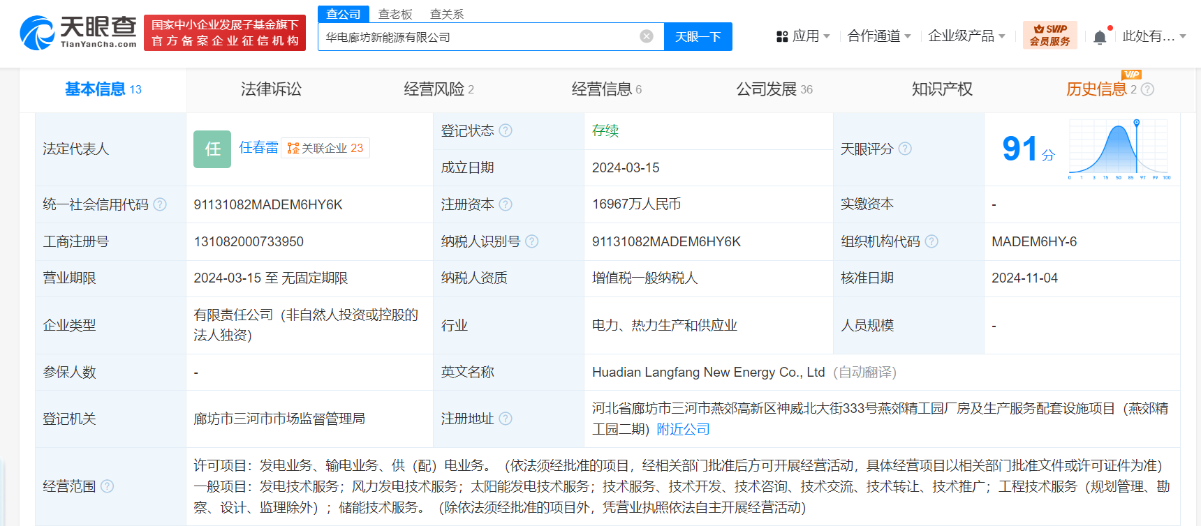 天眼查App显示,近日,华电廊坊新能源有限公司发生工商变更,注册资本由1000万人民币增至约1.7亿人民币。