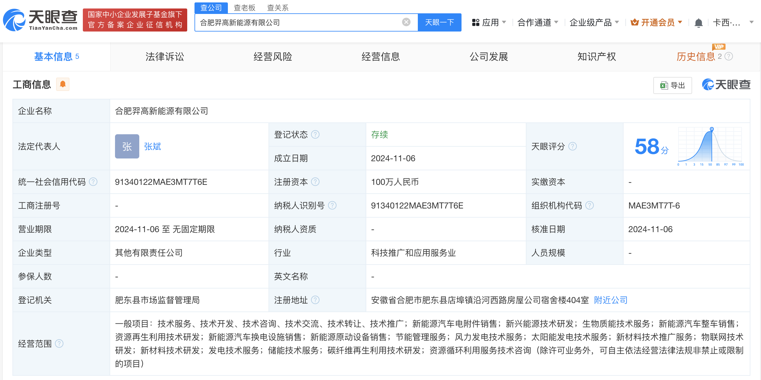 天眼查App显示,近日,合肥羿高新能源有限公司成立,法定代表人为张斌,注册资本100万人民币,经营范围含新能源汽车电附件销售、新能源汽车整车销售、新能源汽车换电设施销售等。股东信息显示,该公司由国轩高科(002074)旗下安徽国轩新能源有限公司以及安徽日羿基础工程有限公司分别持股60%、40%。