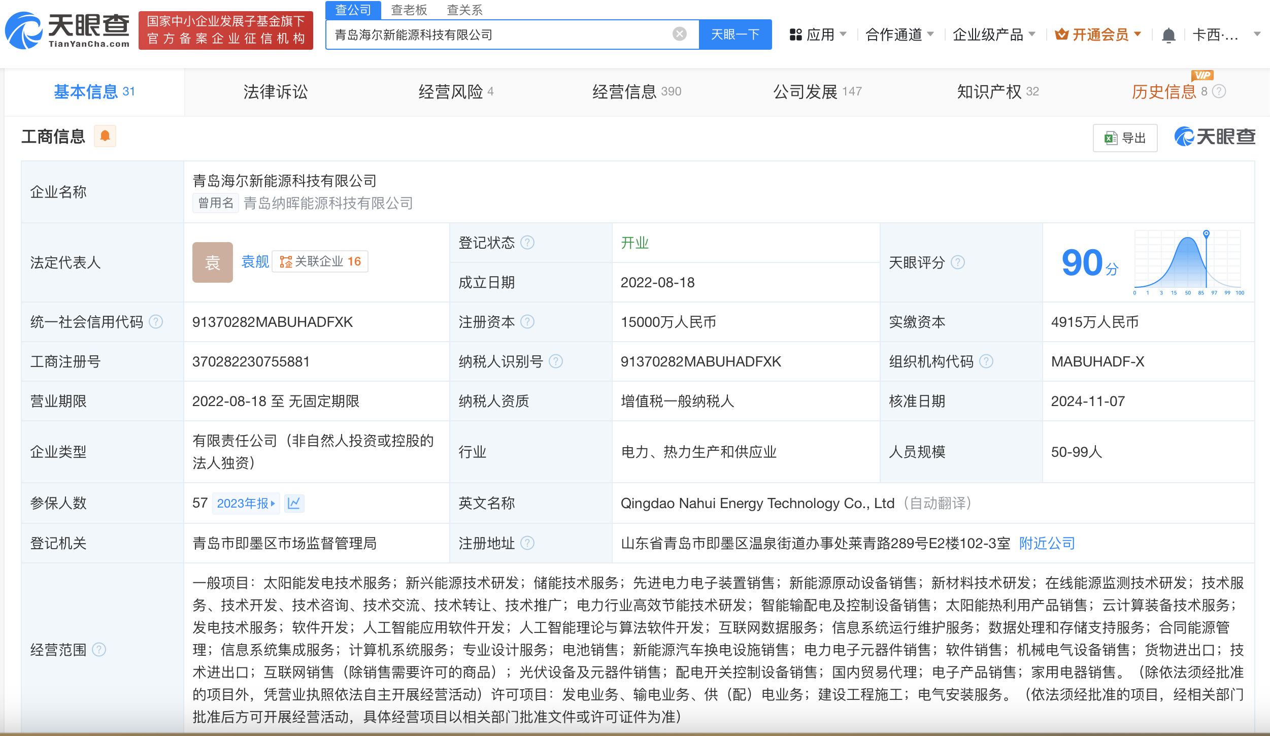 该公司成立于2022年8月,法定代表人为袁舰,注册资本1.5亿人民币,经营范围含太阳能发电技术服务、新兴能源技术研发、储能技术服务等,由海尔旗下纳晖新能源科技有限公司全资持股。