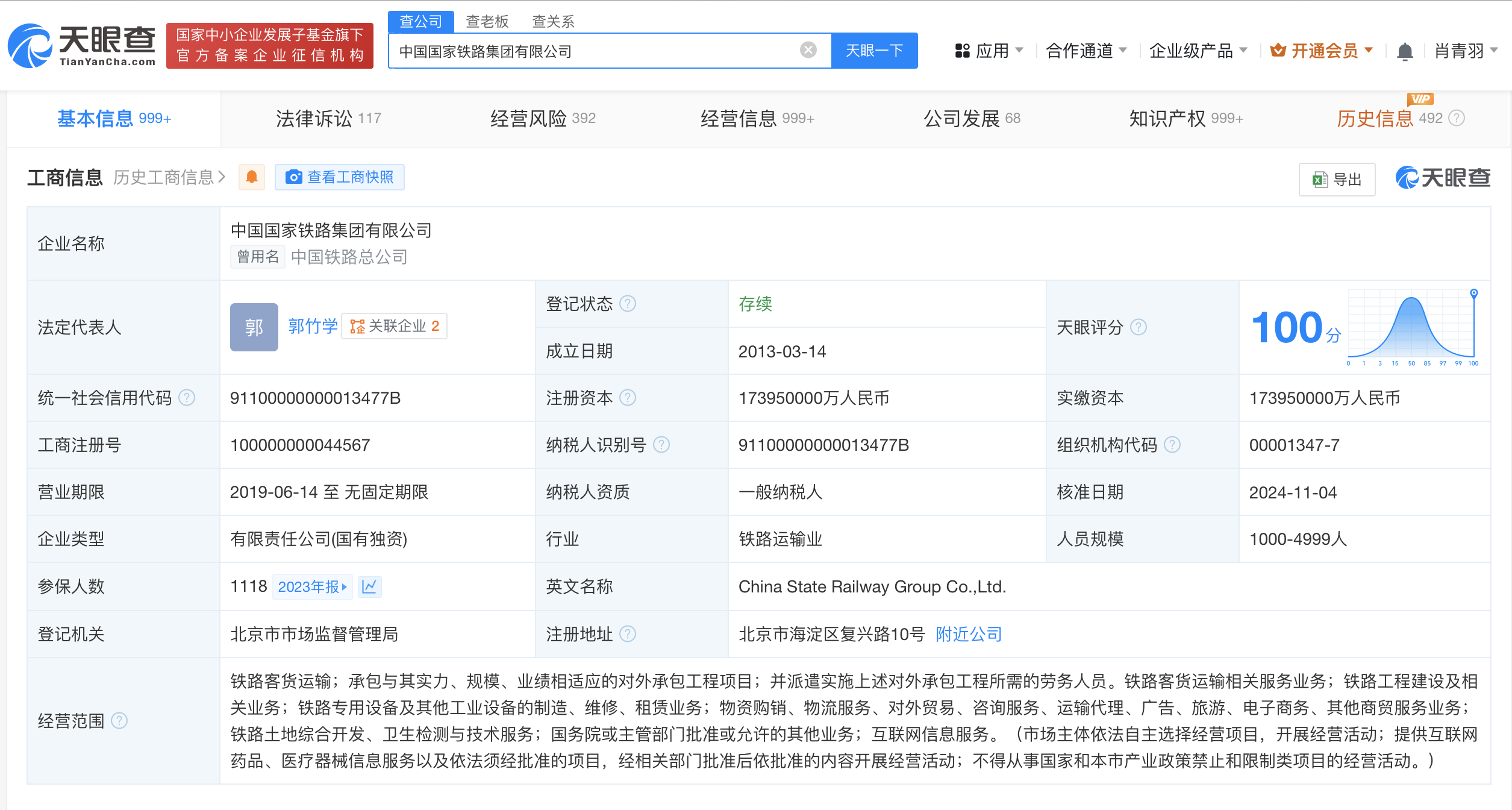 中国国家铁路集团有限公司成立于2013年3月,注册资本17395亿人民币,经营范围含铁路客货运输,物资购销、物流服务、对外贸易、咨询服务、运输代理、广告、旅游、电子商务、其他商贸服务业务等。据媒体报道,近日,国铁集团发布消息,由国铁集团董事、总经理、党组副书记郭竹学出任董事长。