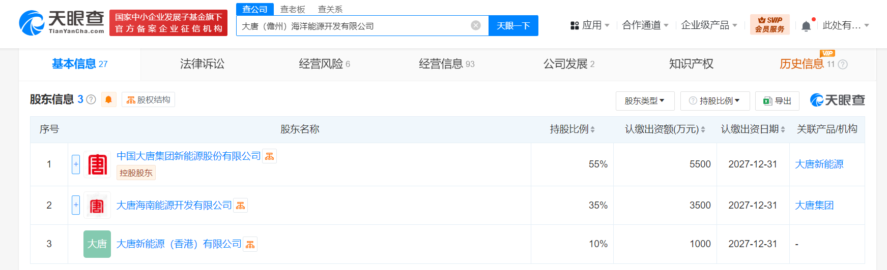 该公司成立于今年1月,法定代表人为张新宇,经营范围含输电业务、供(配)电业务,风力发电技术服务,风电场相关系统研发,海上风电相关系统研发,储能技术服务等。股东信息显示,该公司由中国大唐集团旗下大唐新能源(HK.01798)、大唐海南能源开发有限公司、大唐新能源(香港)有限公司共同持股。