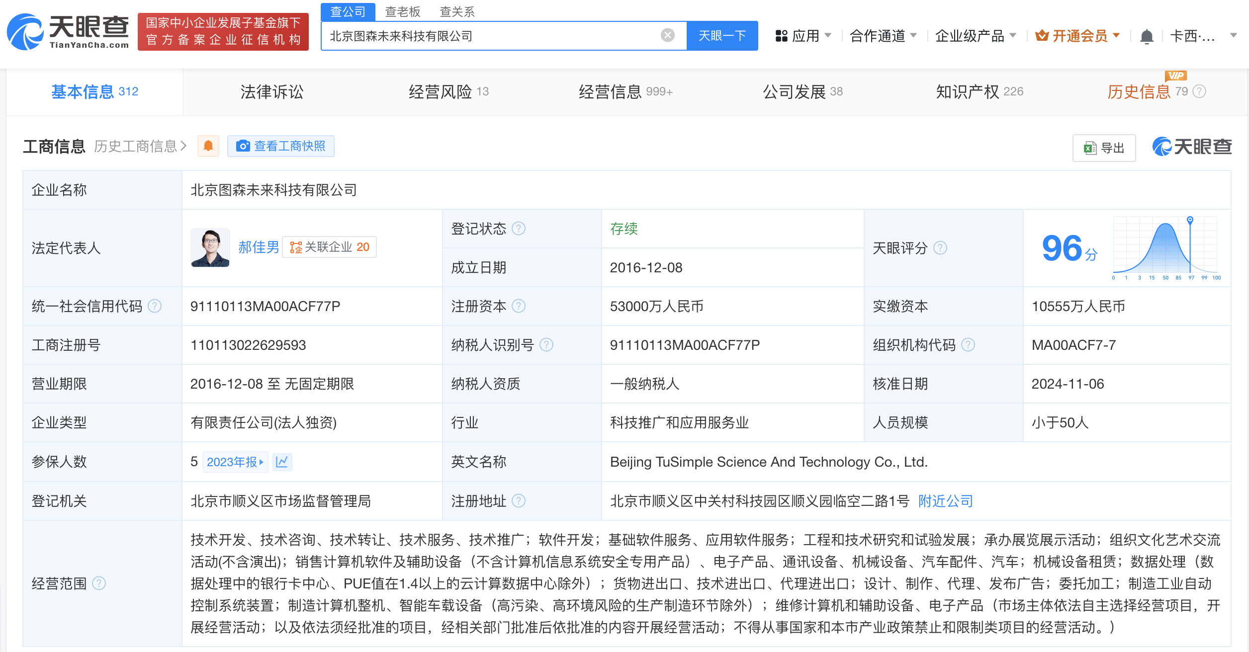北京图森未来科技有限公司成立于2016年12月,法定代表人为郝佳男,经营范围含软件开发,基础软件服务、应用软件服务,工程和技术研究和试验发展等,由北京图森智途科技有限公司全资持股。