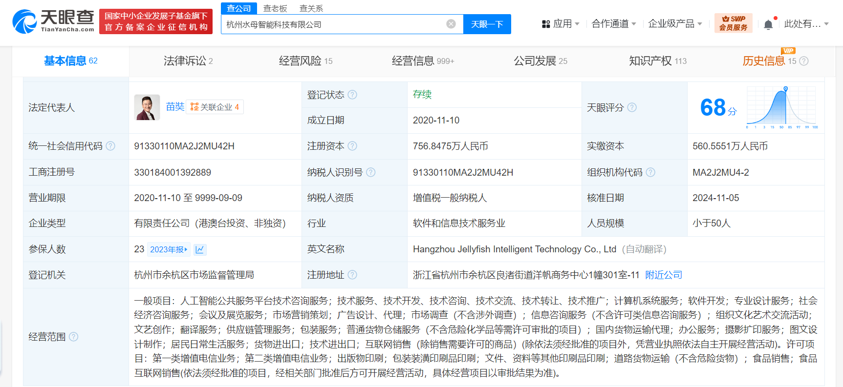 杭州水母智能科技有限公司成立于2020年11月,法定代表人为苗奘,经营范围含人工智能公共服务平台技术咨询服务、信息咨询服务、组织文化艺术交流活动、货物进出口、技术进出口、互联网销售等。股东信息显示,该公司现由北京洛可可科技有限公司、伟旋有限公司、Welight Capital L.P及上述新增股东等共同持股。