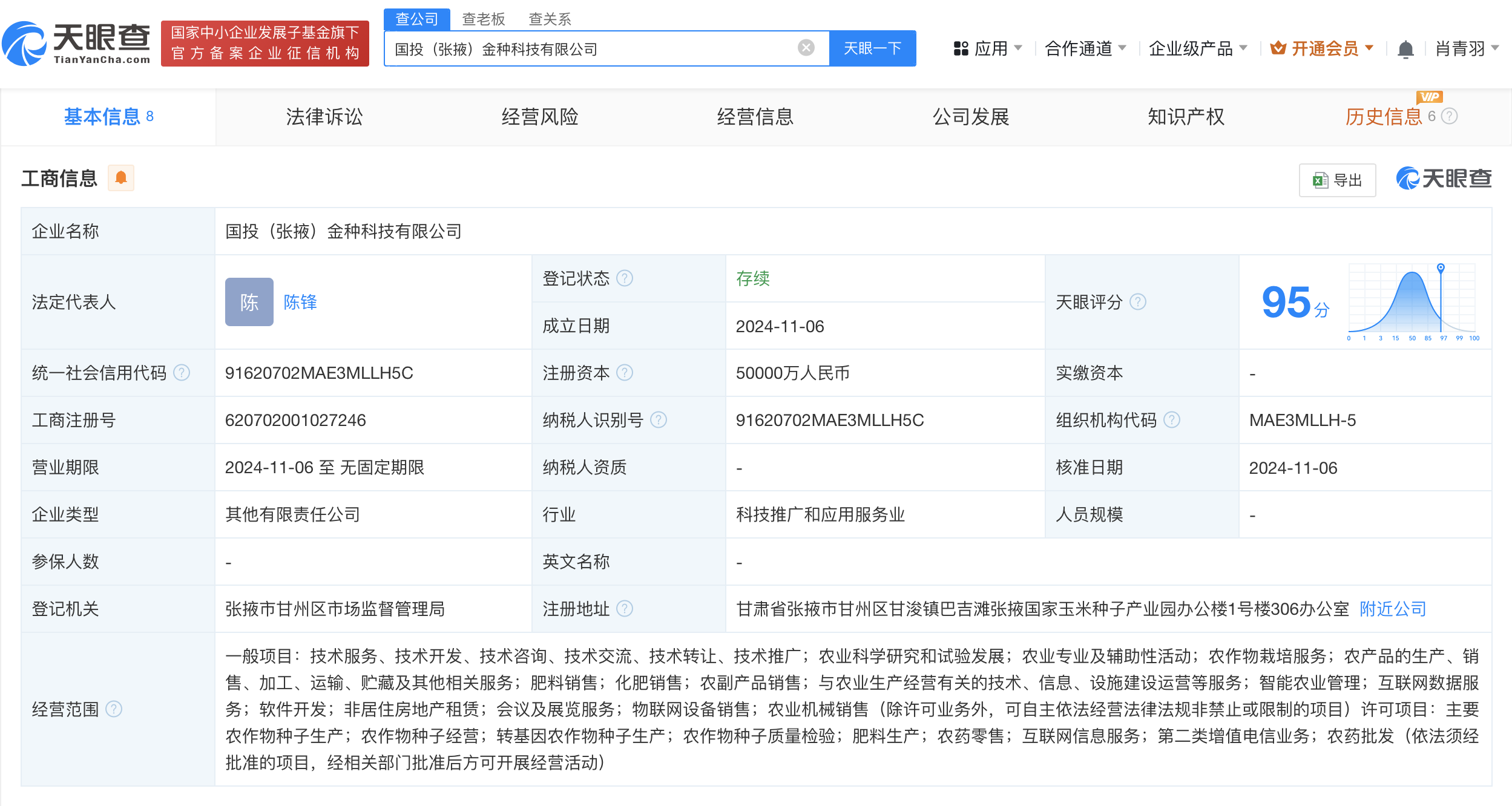 天眼查App显示,近日,国投(张掖)金种科技有限公司成立,法定代表人为陈锋,注册资本5亿人民币,经营范围含主要农作物种子生产、农作物种子经营、转基因农作物种子生产、农作物种子质量检验等。股权全景穿透图显示,该公司由国家开发投资集团有限公司旗下国投种业科技有限公司、张掖现代种业集团有限公司共同持股。