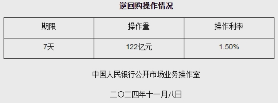 为维护银行体系流动性合理充裕,2024年11月8日人民银行以固定利率、数量招标方式开展了122亿元逆回购操作。具体情况如下: