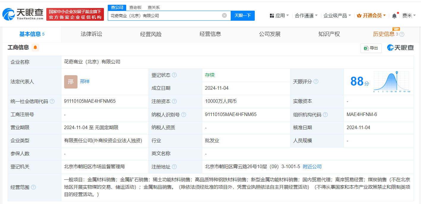 天眼查App显示,近日,花奇商业(北京)有限公司成立,法定代表人为邢祥,注册资本1亿人民币,经营范围含金属材料销售、金属矿石销售、稀土功能材料销售、国内贸易代理、离岸贸易经营、金属制品销售等。股权全景穿透图显示,该公司由花奇控股(北京)有限公司全资持股,后者为花旗金控中国投资有限公司全资子公司。