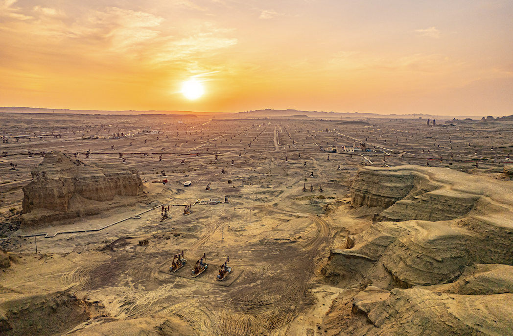 金色的阳光洒在新疆油田风城油田作业区,抽油机在晨光中开始一天的忙碌,整个油区被朝阳映照得熠熠生辉。作为新中国成立后开发建设的第一个大油田,新疆油田(其前身为克拉玛依油田)为我国能源事业作出了巨大贡献。徐志远/摄