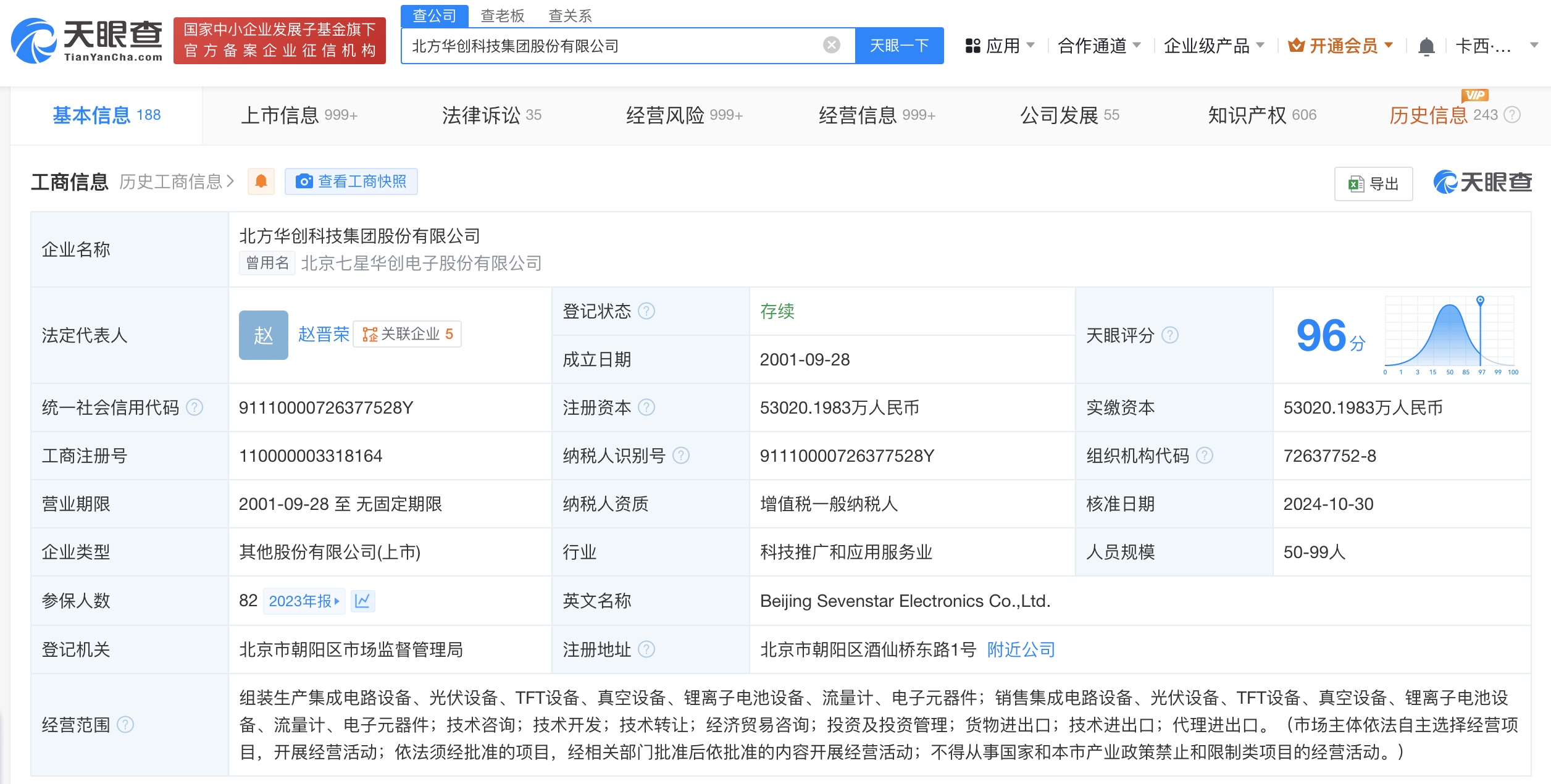 天眼查App显示,近日,北方华创(002371)发生工商变更,注册资本由约4.96亿人民币增至约5.3亿人民币。
