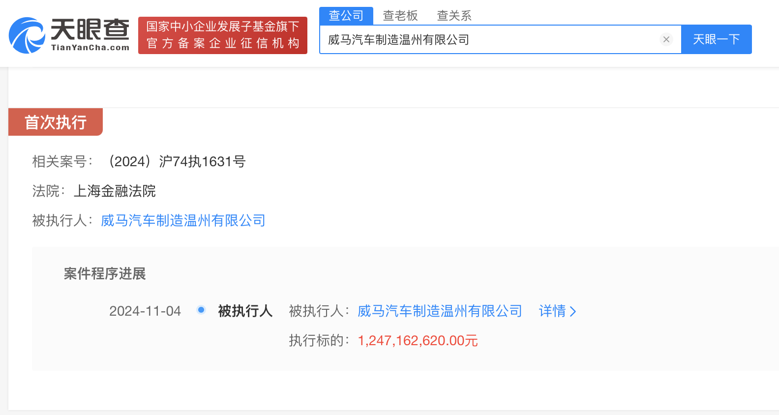 天眼查法律诉讼信息显示,威马汽车制造温州有限公司新增1条被执行人信息,执行标的12.47亿余元,涉及金融借款合同纠纷案件,执行法院为上海金融法院。