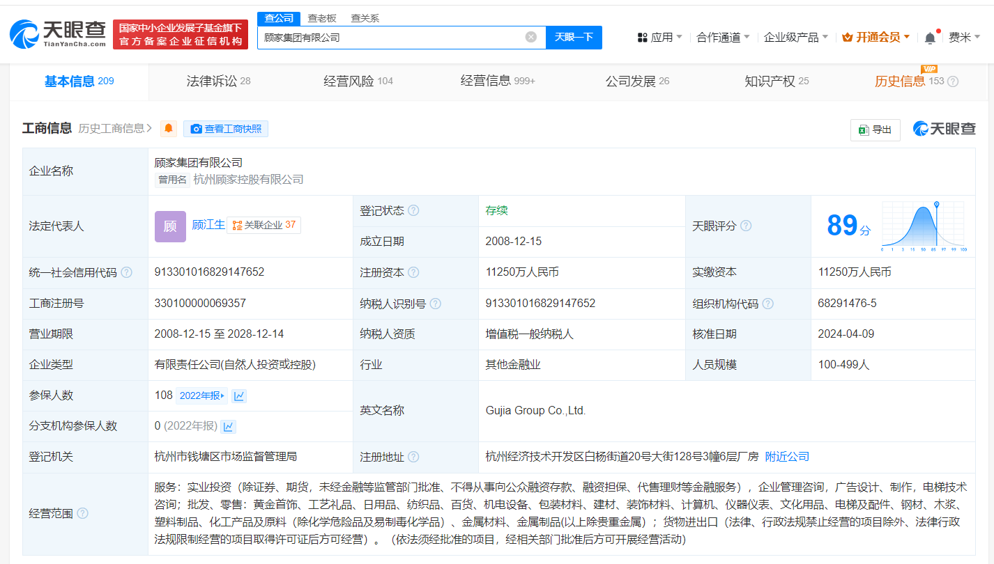 顾家集团有限公司成立于2008年12月,法定代表人为顾江生,注册资本约1.1亿人民币,经营范围含实业投资、企业管理咨询、货物进出口等,由王火仙、顾江生、王才良、王丽英共同持股。
