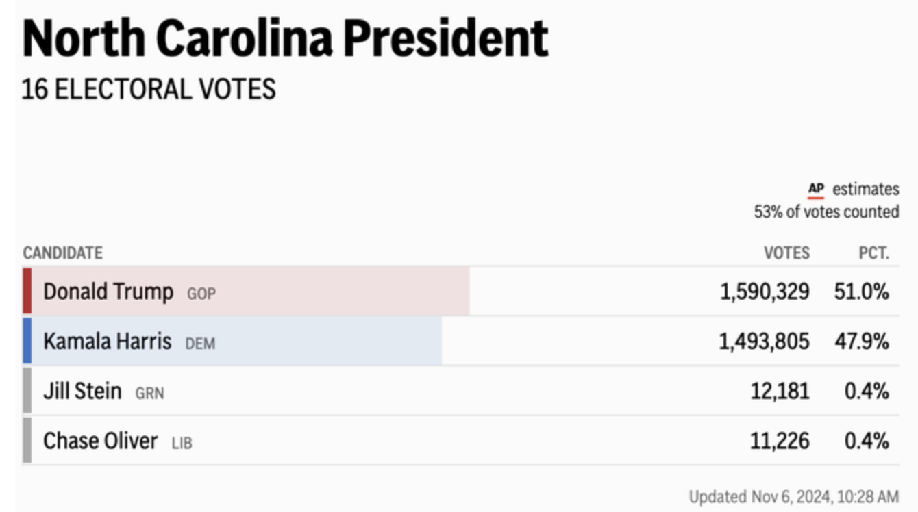 美国大选中,拥有16张选举人票的关键摇摆州北卡罗来纳州的投票即将结束。截至发稿,53%的选票已被计入,美联社统计显示特朗普在该州暂时领先,得票率为51.0%,哈里斯得票率47.9%。