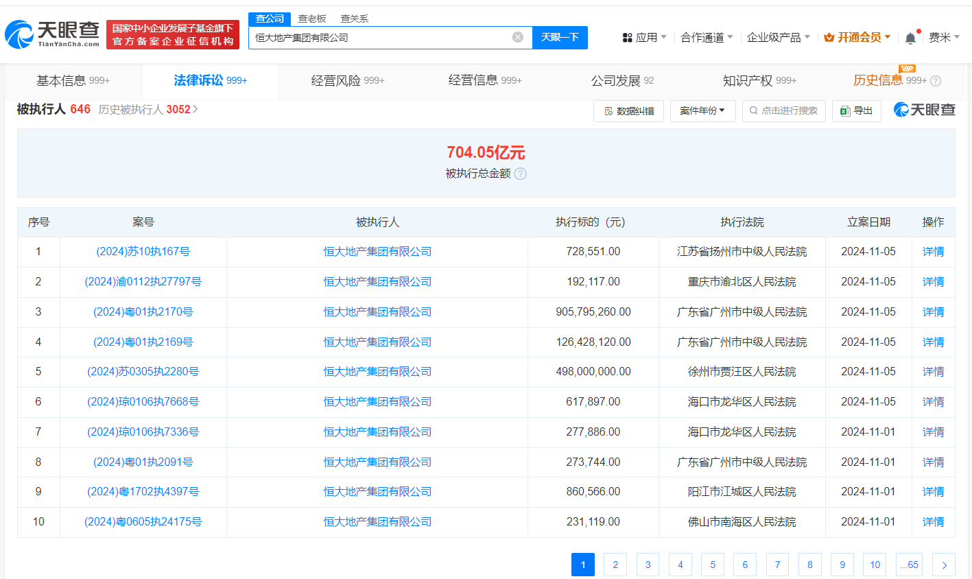 天眼查法律诉讼信息显示,11月5日,恒大地产集团有限公司新增6条被执行人信息,执行标的合计15.3亿余元,涉及金融借款合同纠纷、票据纠纷等案件,部分案件被执行人还包括东莞君爵酒店、徐州御嘉置业有限公司、徐州恒冠置业有限公司等,执行法院包括广东省广州市中级人民法院、徐州市贾汪区人民法院、海口市龙华区人民法院等。