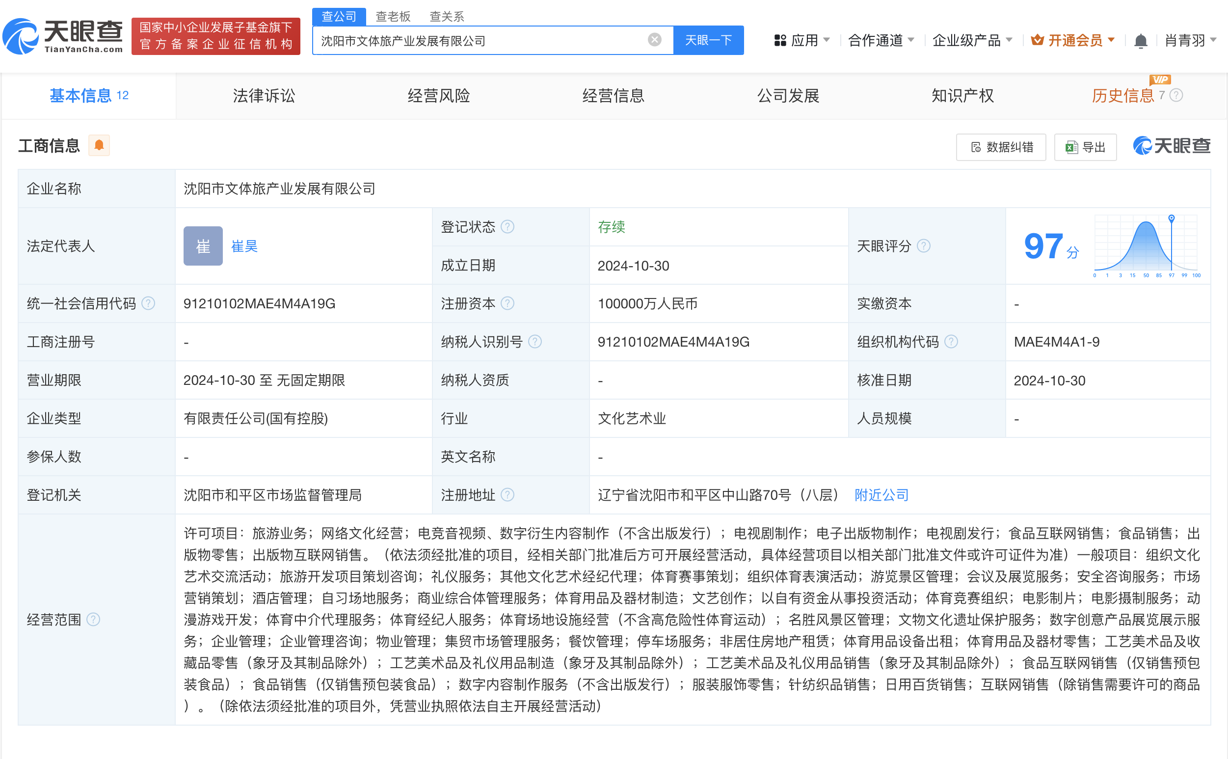 天眼查App显示,近日,沈阳市文体旅产业发展有限公司成立,法定代表人为崔昊,注册资本10亿人民币,经营范围含旅游业务、网络文化经营、组织文化艺术交流活动、旅游开发项目策划咨询、体育赛事策划等。股东信息显示,该公司由沈阳市人民政府国有资产监督管理委员会、沈阳城投资产经营有限公司、沈阳盛京百货管理(集团)有限公司、沈阳地铁经营有限公司共同持股