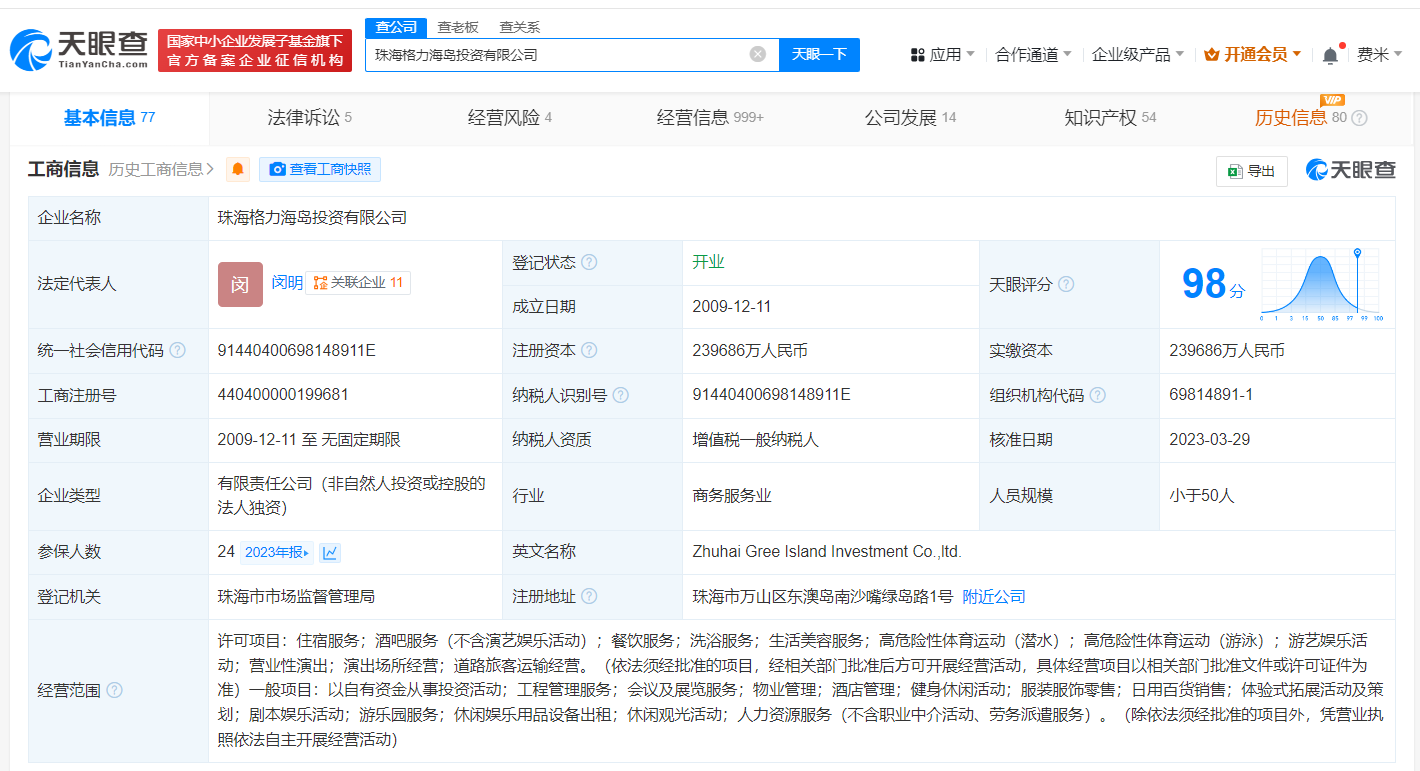 珠海格力海岛投资有限公司成立于2009年12月,法定代表人为闵明,经营范围含住宿服务、餐饮服务、洗浴服务、生活美容服务、游艺娱乐活动、营业性演出等,由珠海格力集团有限公司全资持股。