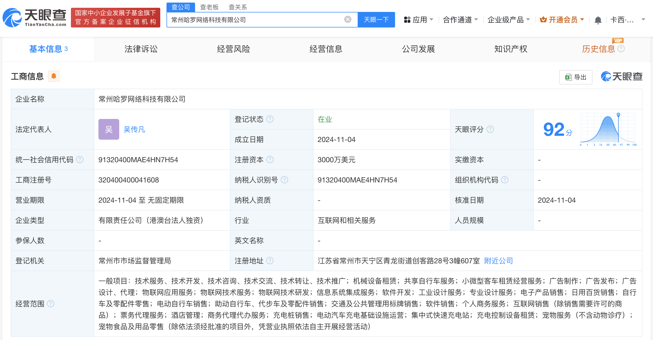 天眼查App显示,近日,常州哈罗网络科技有限公司成立,法定代表人为吴传凡,注册资本3000万美元,经营范围含电动自行车销售,助动自行车、代步车及零配件销售,电动汽车充电基础设施运营等。股东信息显示,该公司由哈啰出行旗下Hong Kong RideTech Limited全资持股。
