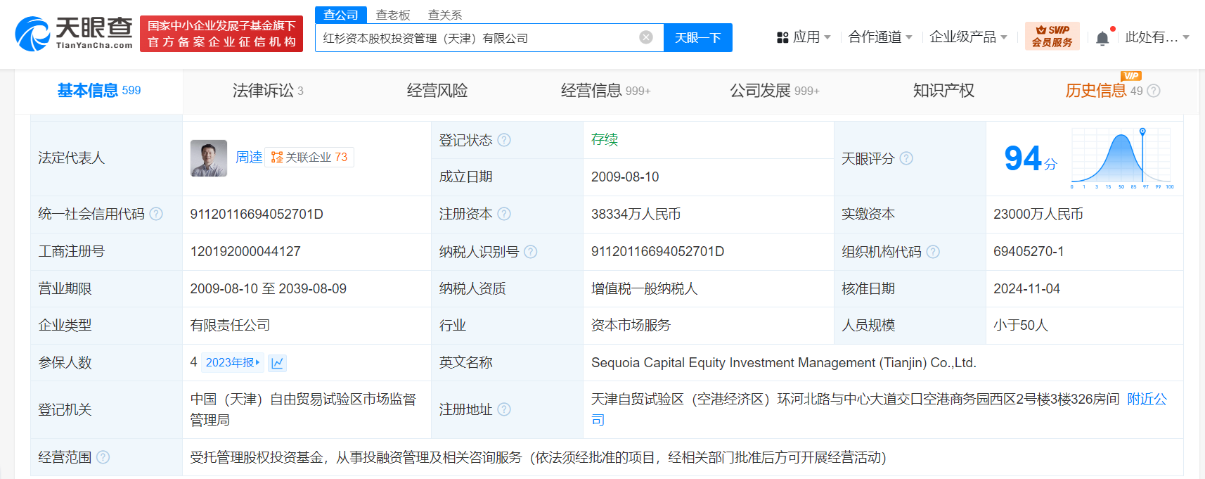 天眼查App显示,近日,红杉资本关联公司红杉资本股权投资管理(天津)有限公司发生工商变更,注册资本由3亿人民币增至约3.83亿人民币。