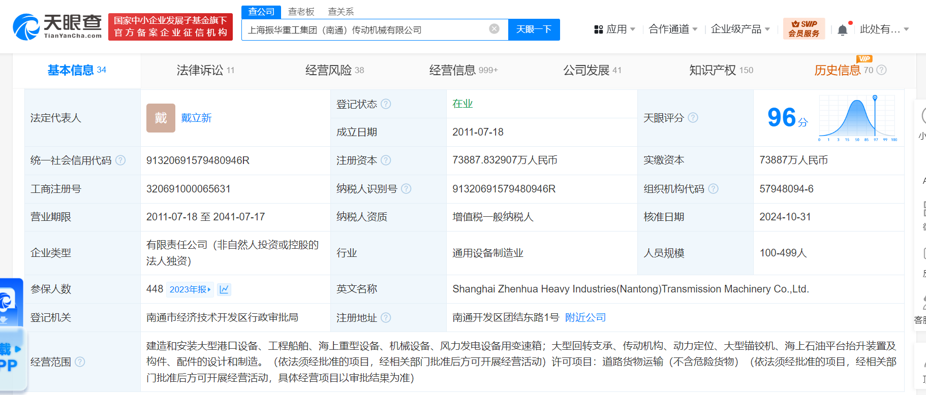 上海振华重工集团(南通)传动机械有限公司成立于2011年7月,法定代表人为戴立新,注册资本约7.39亿人民币,经营范围含建造和安装大型港口设备、工程船舶、海上重型设备、机械设备、风力发电设备用变速箱,大型回转支承、传动机构、动力定位、大型锚铰机、海上石油平台抬升装置及构件、配件的设计和制造等。股东信息显示,该公司现由振华重工(600320)全资持股。