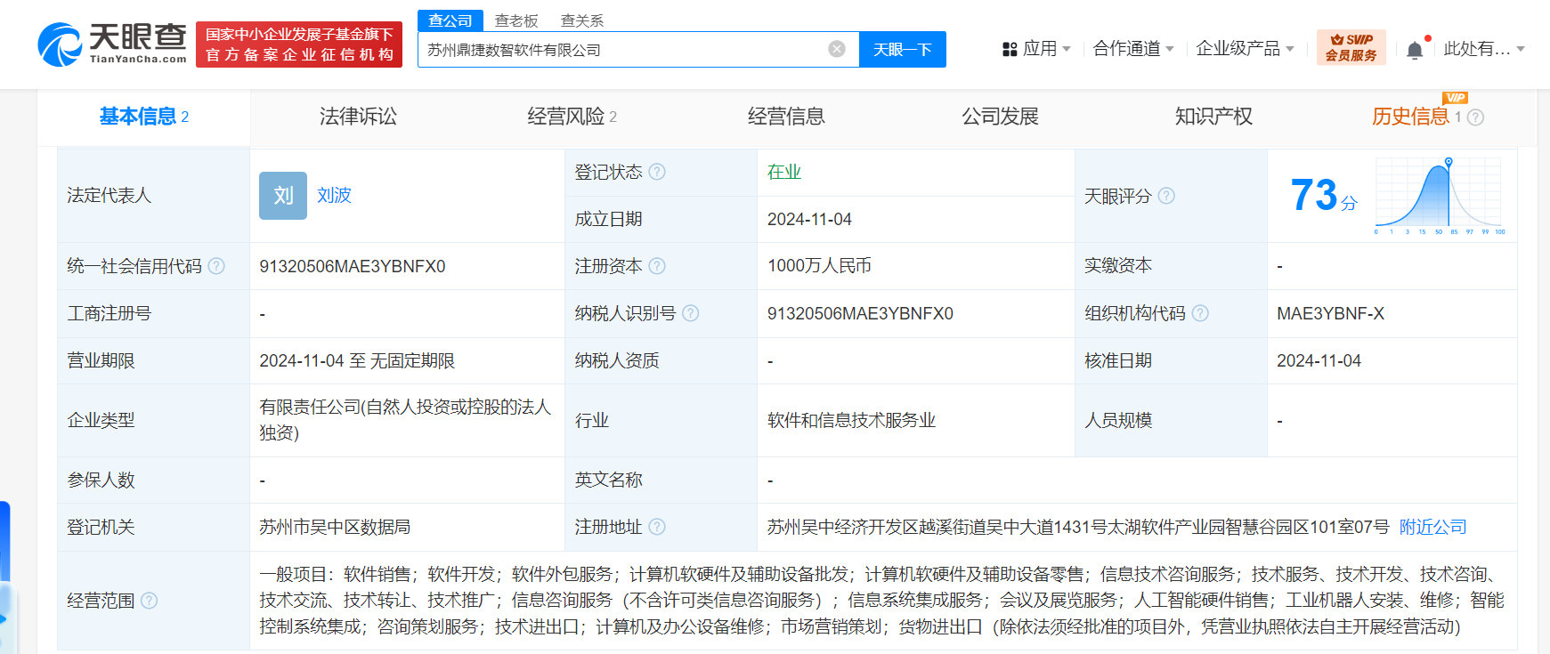 天眼查App显示,近日,苏州鼎捷数智软件有限公司成立,法定代表人为刘波,注册资本1000万人民币,经营范围含软件销售,软件开发,计算机软硬件及辅助设备批发,计算机软硬件及辅助设备零售,信息技术咨询服务,人工智能硬件销售,工业机器人安装、维修等。股东信息显示,该公司由鼎捷数智(300378)全资持股。