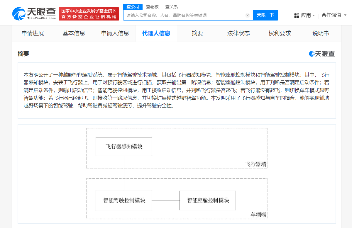 摘要显示,本专利包括飞行器感知模块、智能座舱控制模块和智能驾驶控制模块;其中,飞行器感知模块用于对预行驶区域进行扫描,获取并输出第一路况信息;智能座舱控制模块,用于判断是否满足启动条件;若满足启动条件,则输出启动信号;智能驾驶控制模块,用于接收启动信号,并判断飞行器是否起飞;若飞行器没有起飞,则切换单车模式越野智驾功能;若飞行器已经起飞,则接收第一路况信息,并切换扩展模式越野智驾功能。本发明采用了飞行器感知与自车的结合,能够实现辅助越野场景下的智能驾驶,帮助驾驶员减轻驾驶疲劳、提升驾驶安全性。