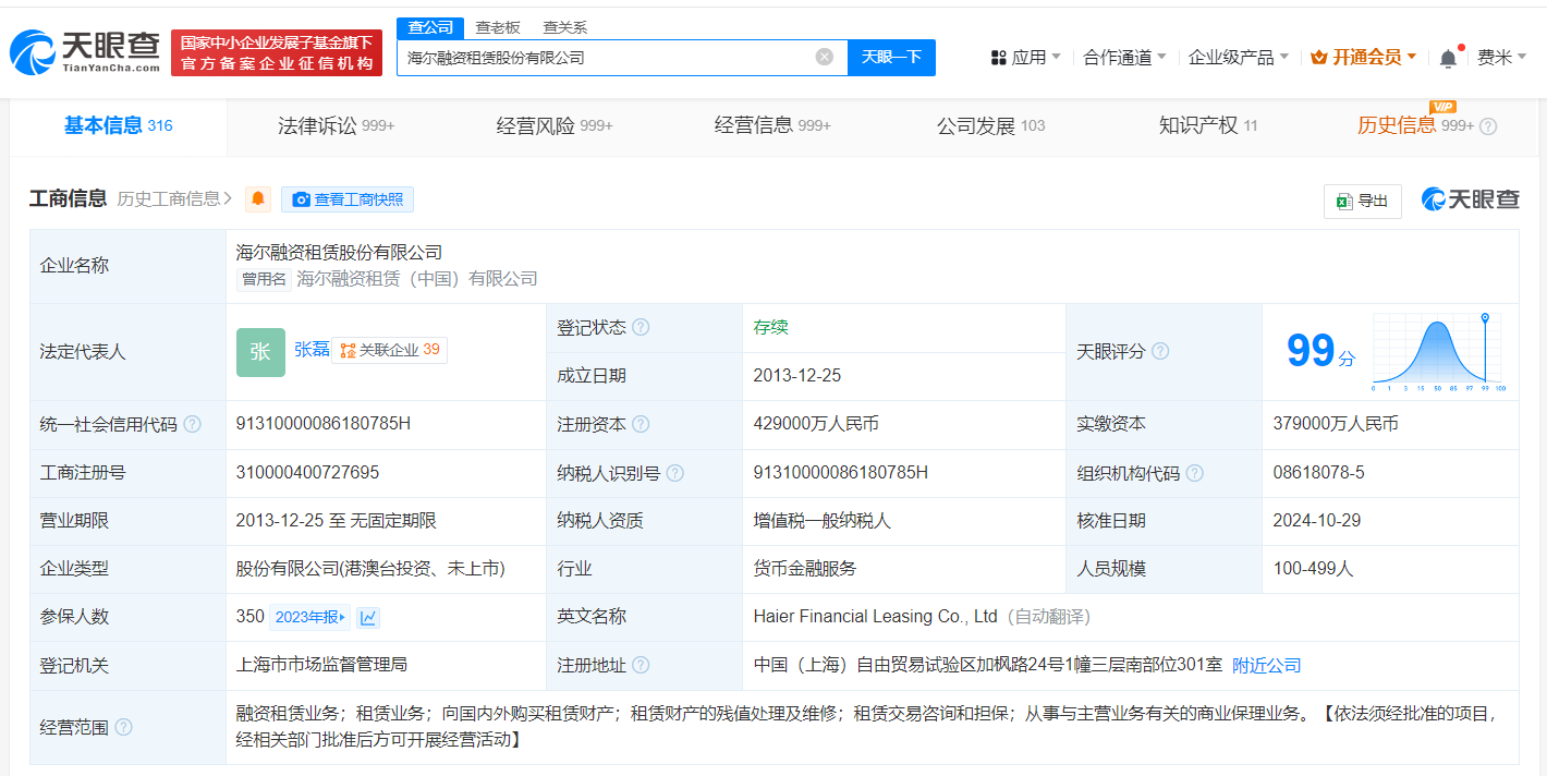 天眼查App显示,近日,海尔融资租赁股份有限公司发生工商变更,注册资本由37.9亿人民币增至42.9亿人民币,增幅约13%。