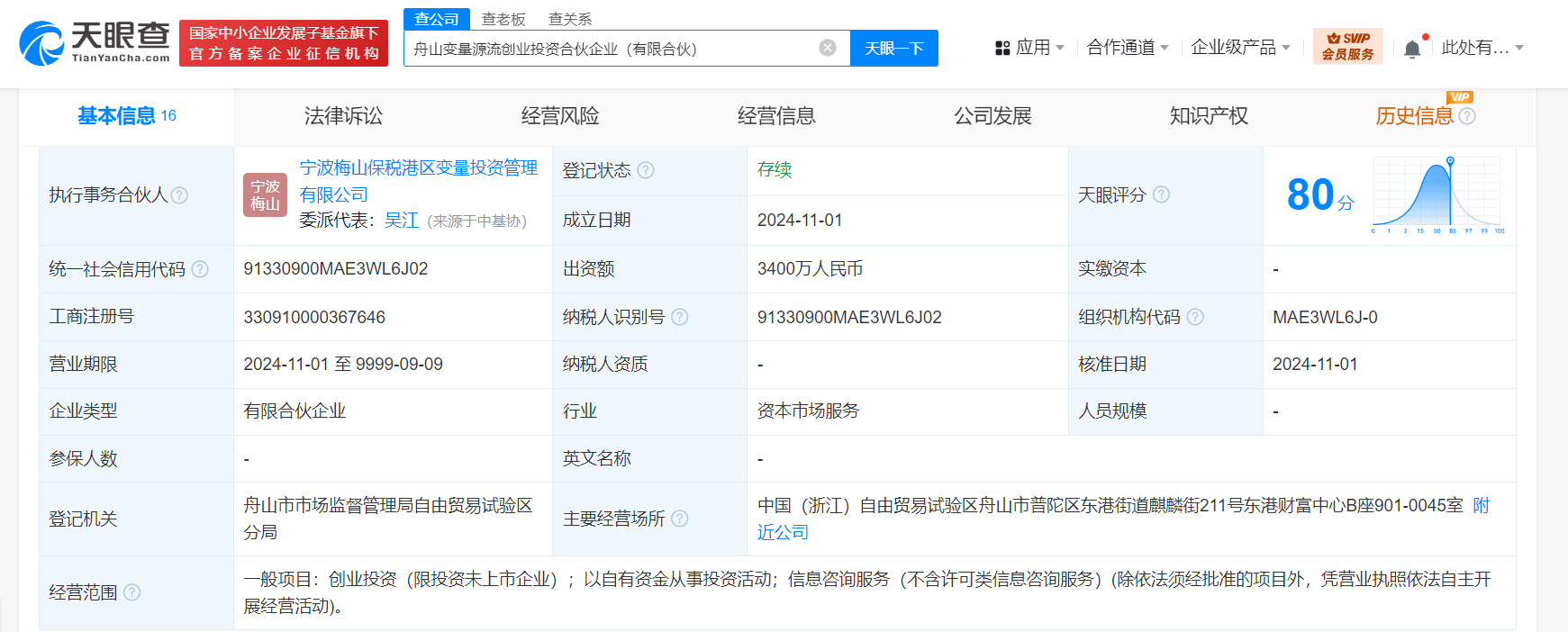 天眼查App显示,近日,舟山变量源流创业投资合伙企业(有限合伙)成立,执行事务合伙人为宁波梅山保税港区变量投资管理有限公司,出资额3400万人民币,经营范围为创业投资、以自有资金从事投资活动、信息咨询服务。合伙人信息显示,该企业由蓝色光标(300058)旗下北京蓝色光标企业管理中心(有限合伙)、小红书关联公司行吟信息科技(上海)有限公司等16位合伙人共同出资。