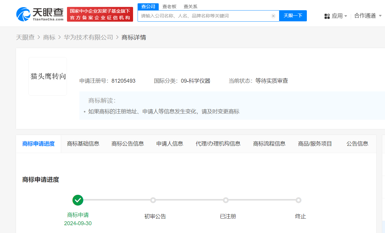 天眼查知识产权信息显示,近日,华为技术有限公司申请注册“猫头鹰转向”“鸿蒙智行猫头鹰”商标,国际分类为运输工具、科学仪器,当前商标状态均为等待实质审查。