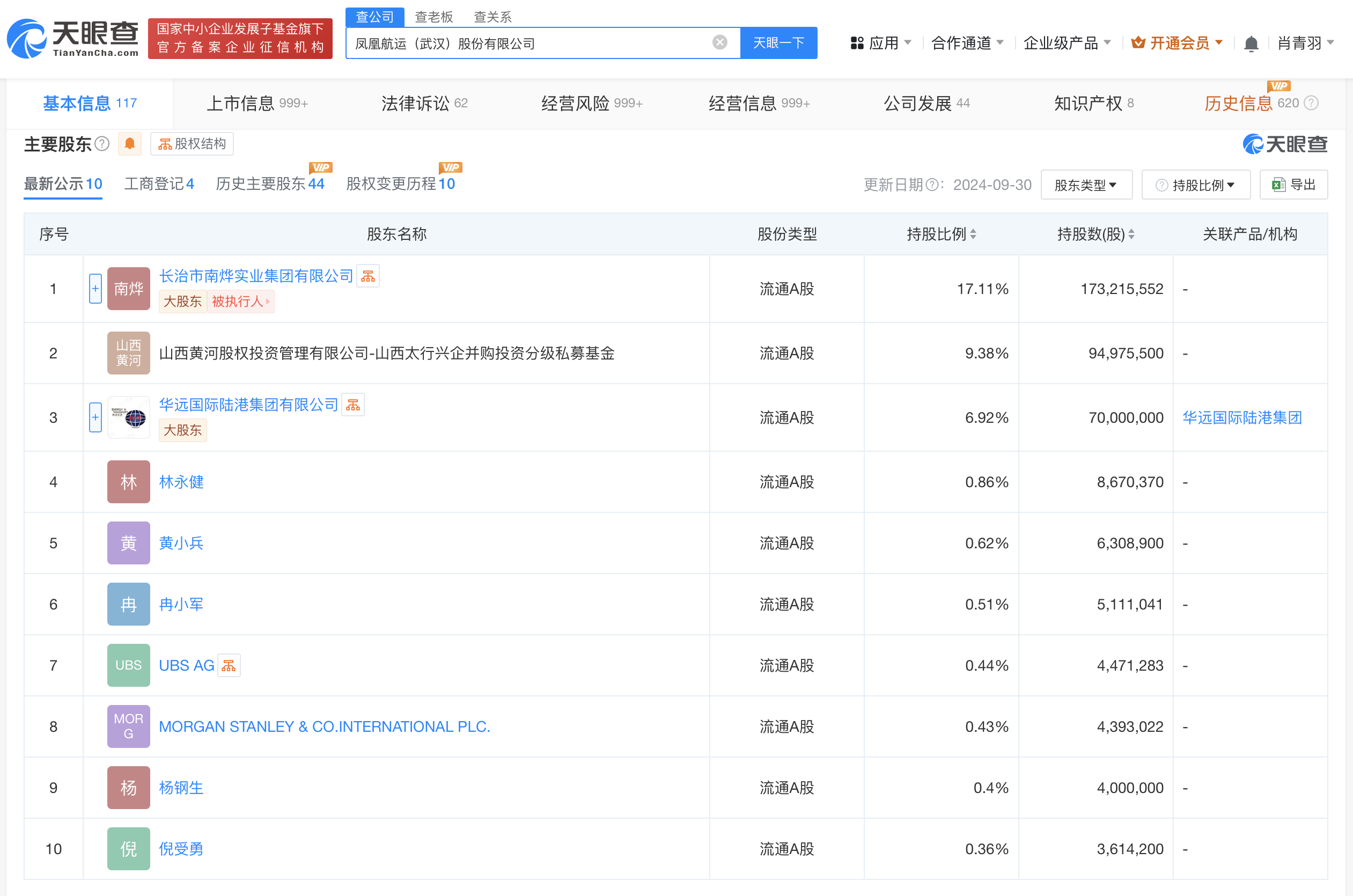 凤凰航运(武汉)股份有限公司成立于1992年6月,注册资本约10.1亿人民币,经营范围含国内货物运输代理、国内船舶代理、船舶租赁、船舶销售、船舶拖带服务等,由长治市南烨实业集团有限公司、华远国际陆港集团有限公司等共同持股。此前该公司发布公告称,今年8月,该公司董事会收到董事长张军的辞职报告,张军因个人原因辞去公司第九届董事会董事、董事长、董事会下属各专门委员会职务。随后,经选举,王岩科任公司第九届董事会董事长,任期至第九届董事会届满之日止。