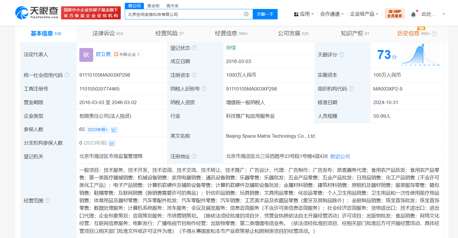 北京空间变换科技有限公司成立于2016年3月,注册资本1000万人民币,由今日头条有限公司全资持股。