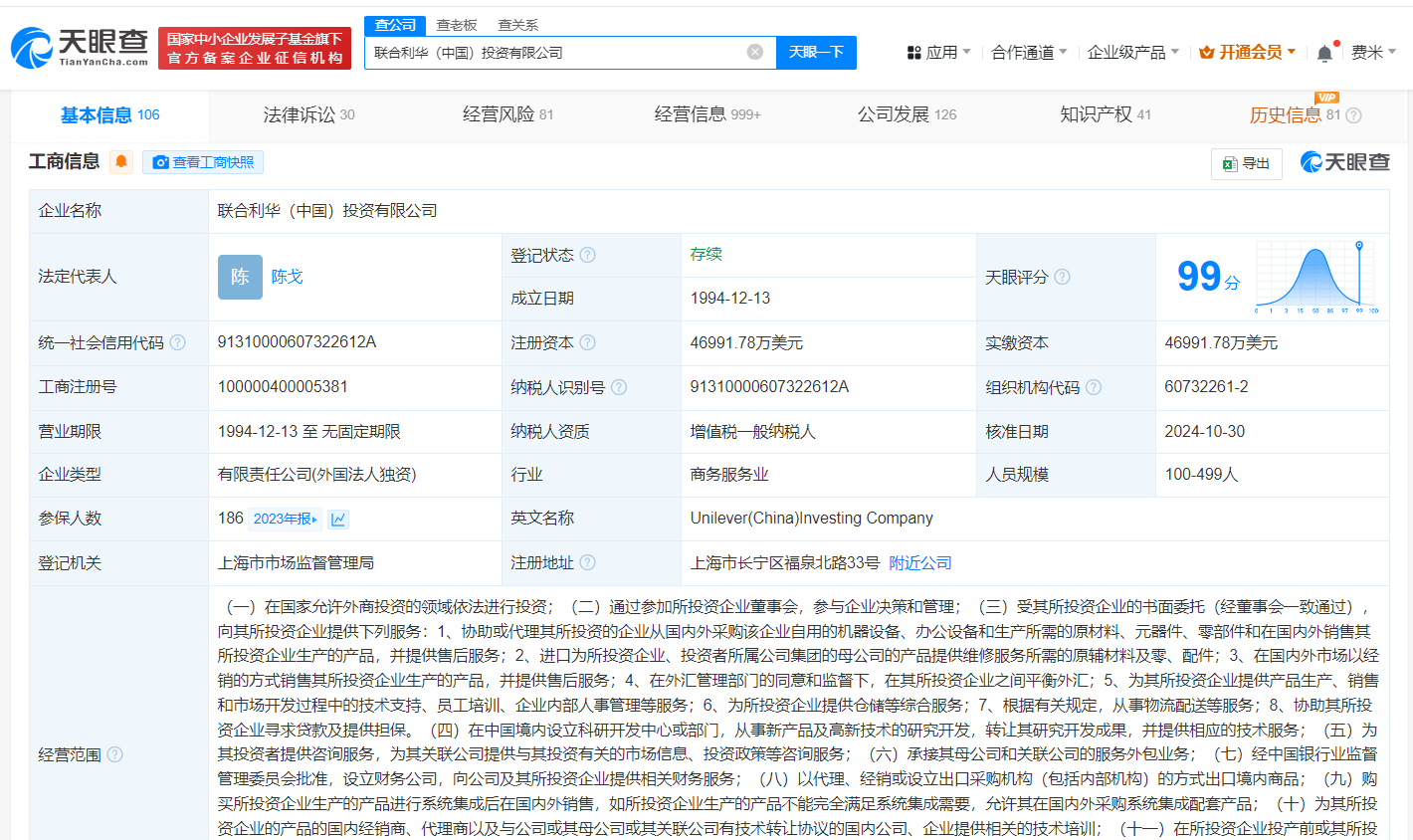 天眼查App显示,近日,联合利华(中国)投资有限公司发生工商变更,瞿巍卸任法定代表人、董事长,由陈戈接任,同时发生董事变更。