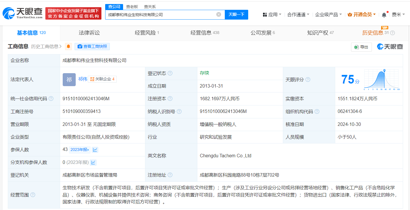 成都泰和伟业生物科技有限公司成立于2013年1月,法定代表人为祁伟,经营范围含生物技术研发、商务咨询、货物进出口等,现由祁伟、赵虎、中信证券投资有限公司及上述新增股东等共同持股。变更记录显示,去年12月,茅台旗下茅台金石(贵州)产业发展基金合伙企业(有限合伙)就曾入股公司。官网显示,该公司是一家专业从事保护氨基酸系列产品研发、生产与销售的生物科技企业。