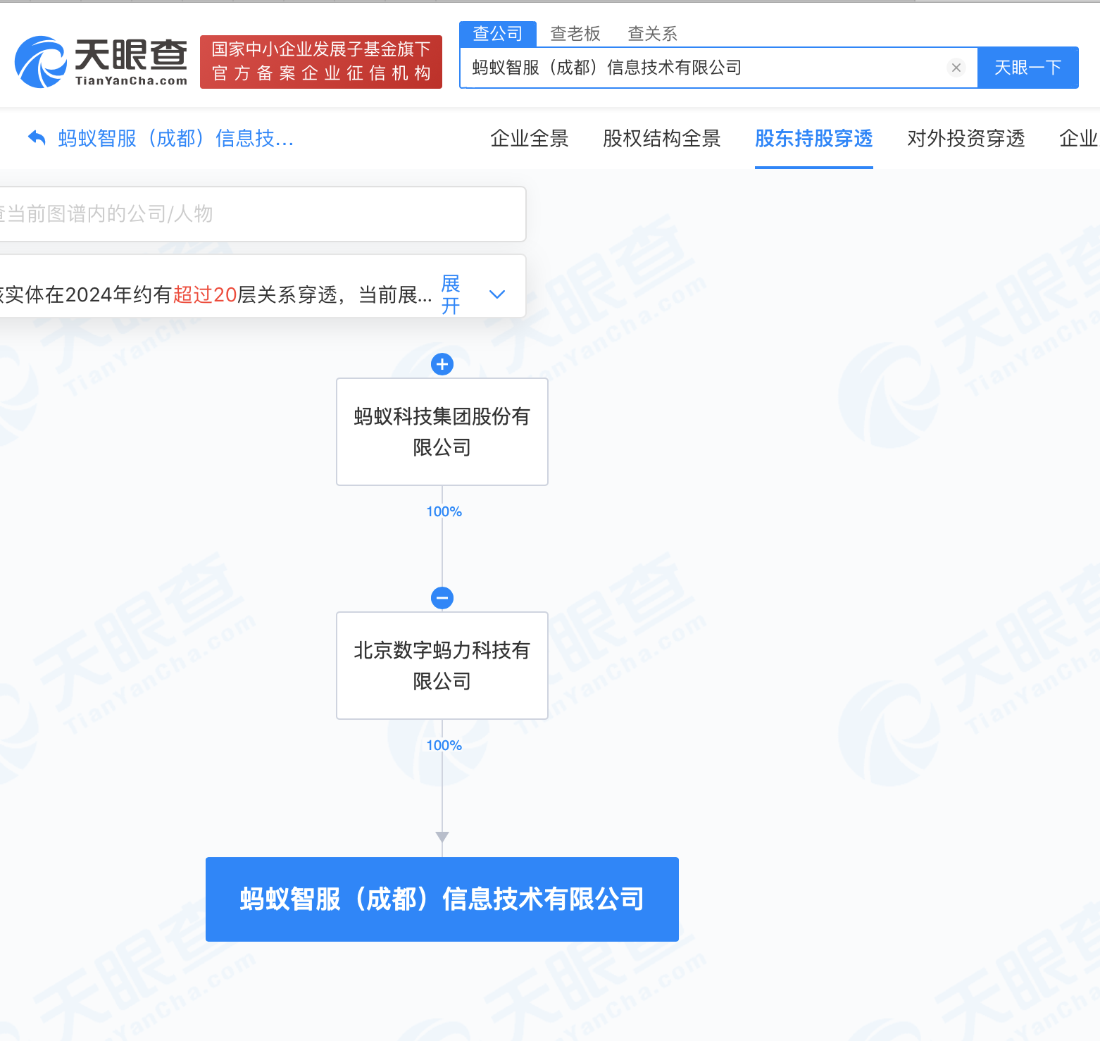 蚂蚁智服(成都)信息技术有限公司成立于2011年6月,法定代表人为周芸,经营范围含云计算装备技术服务、企业管理、企业管理咨询、信息咨询服务、信息技术咨询服务、大数据服务等。股权全景穿透图显示,该公司现由北京数字蚂力科技有限公司全资持股,后者为蚂蚁科技集团股份有限公司全资子公司。