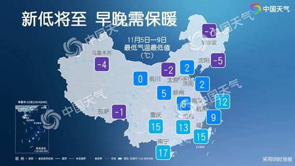 中国天气网讯 今天(11月4日),强冷空气将继续我国,东北、华北、黄淮等地成为降温集中区域,明天江淮、江南等地气温将小幅下降。冷空气影响过后,最低气温将出现在5日至6日早晨,最低气温0℃线位于华北中北部至陕西中北部、甘肃南部一带,届时全国气温将大面积刷新今年立秋以来新低。