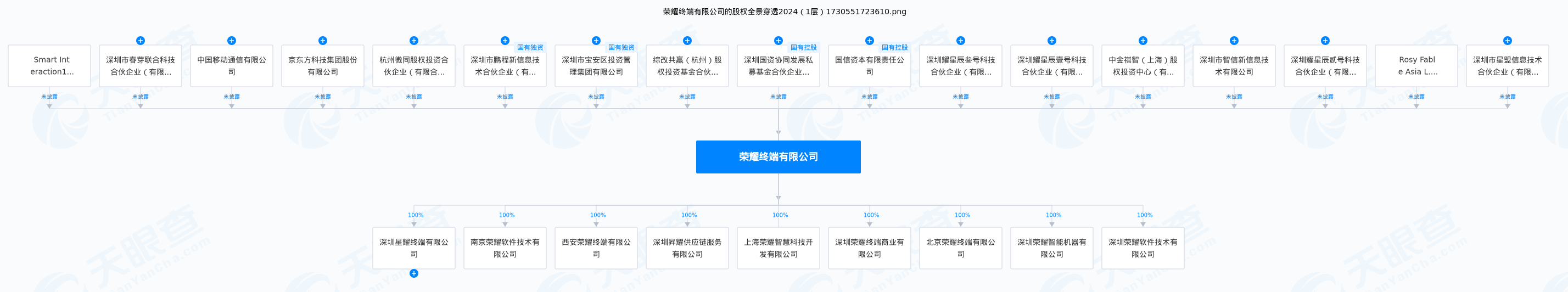 天眼查显示,截至11月2日,荣耀公司股东已包括杭州微同股权投资合伙企业(有限合伙)、中国移动、京东方、中金祺智(上海)股权投资中心(有限合伙)等17家。最新引入的几家尚未收纳进入。
