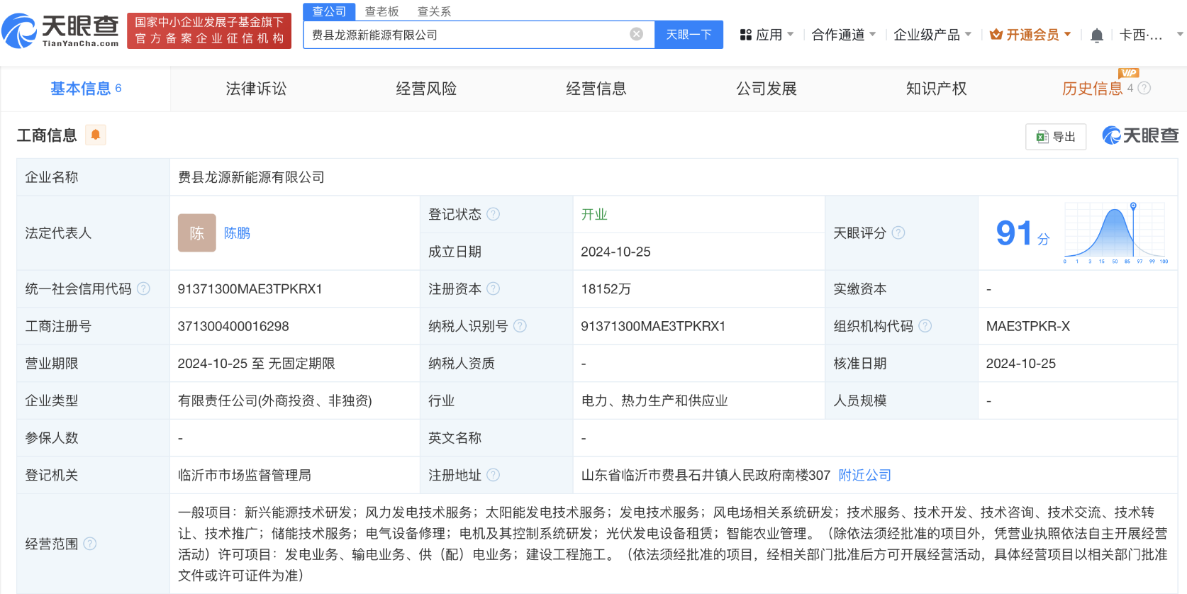 天眼查App显示,近日,费县龙源新能源有限公司成立,法定代表人为陈鹏,注册资本约1.82亿人民币,经营范围含新兴能源技术研发、风力发电技术服务、太阳能发电技术服务等。股东信息显示,该公司由龙源电力(001289)、雄亚(维尔京)有限公司共同持股。