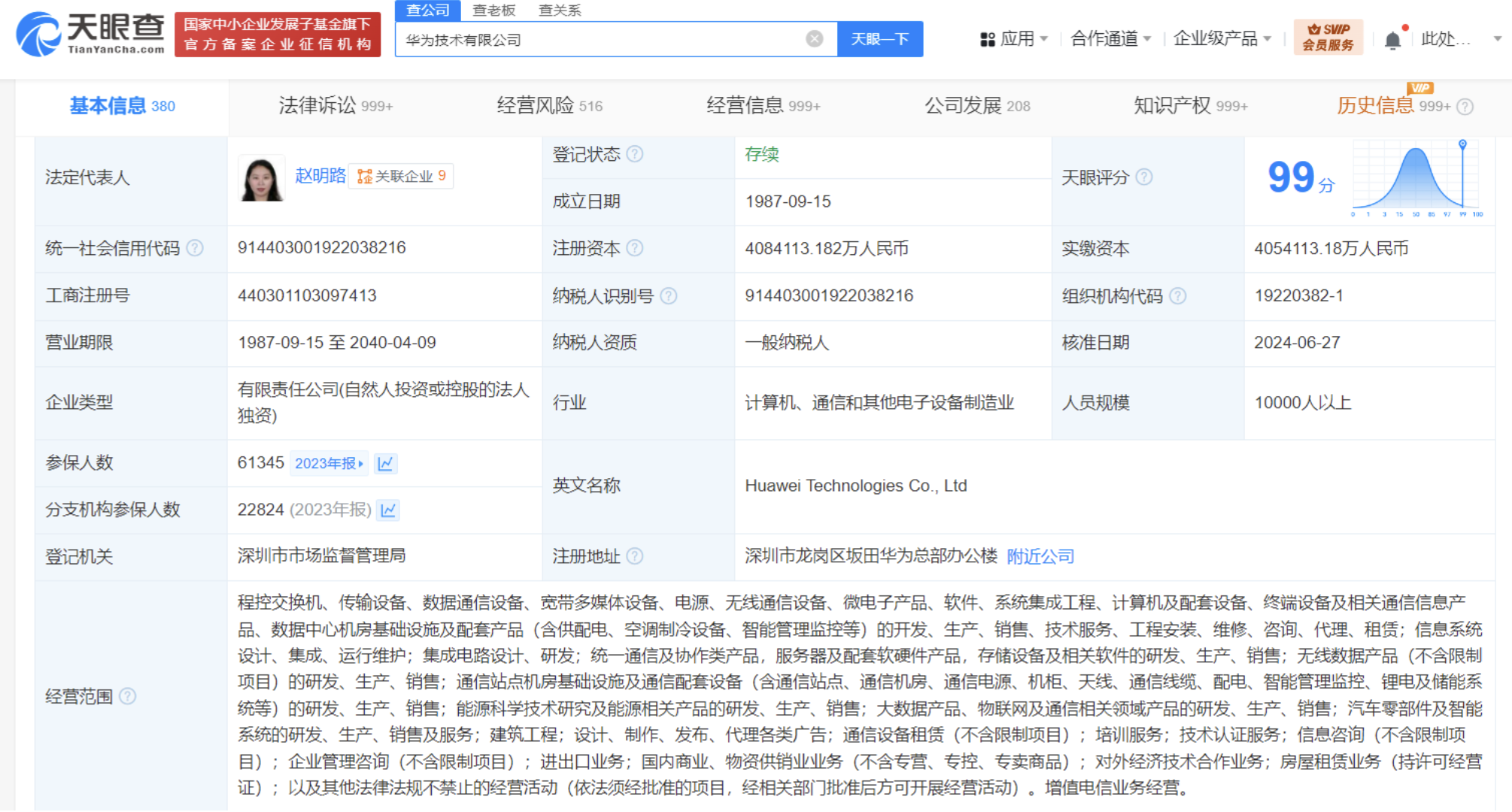 华为技术有限公司成立于1987年9月,法定代表人为赵明路,注册资本约408.4亿人民币,由华为投资控股有限公司全资持股。