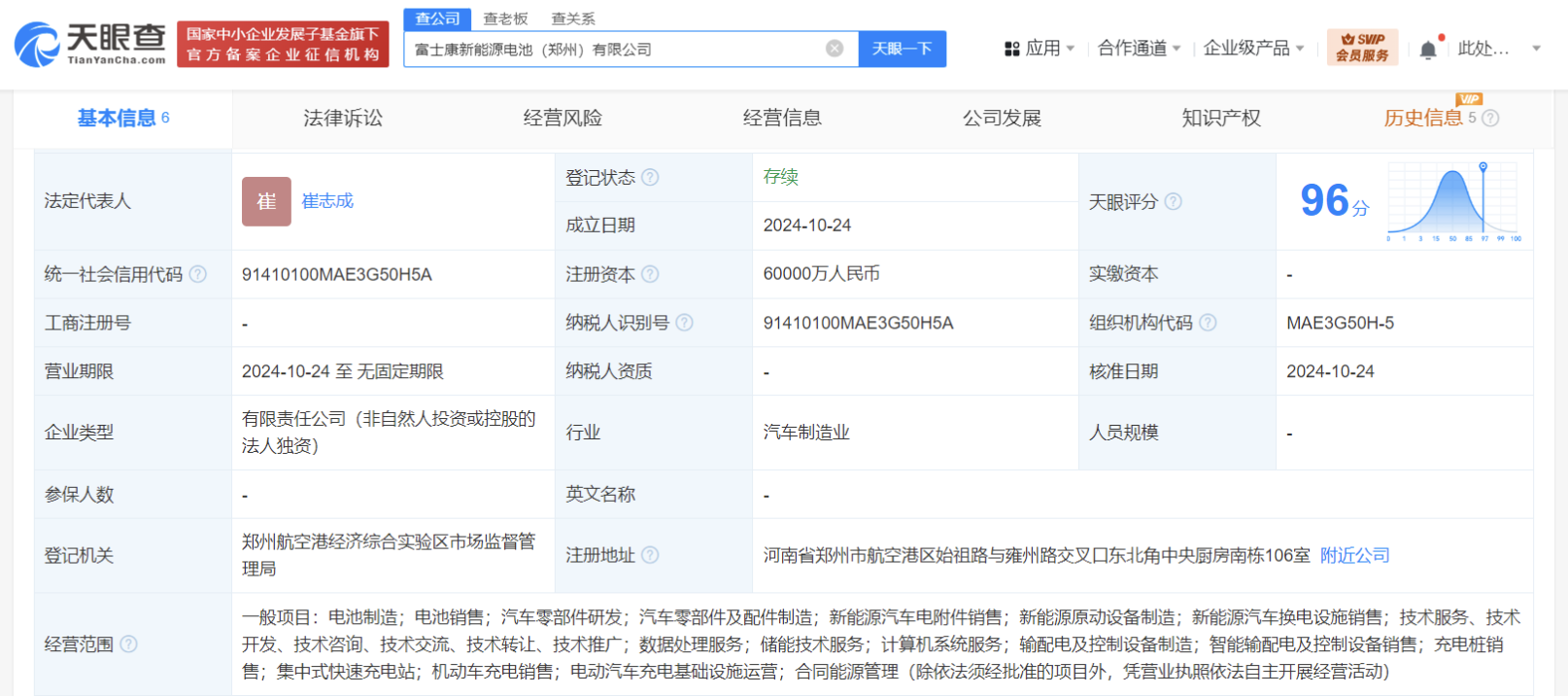 天眼查App显示,近日,富士康新能源电池(郑州)有限公司成立,法定代表人为崔志成,注册资本6亿人民币,经营范围含电池制造、电池销售、汽车零部件研发、汽车零部件及配件制造、新能源汽车电附件销售、新能源原动设备制造、新能源汽车换电设施销售等,由富士康新事业发展集团有限公司全资持股。