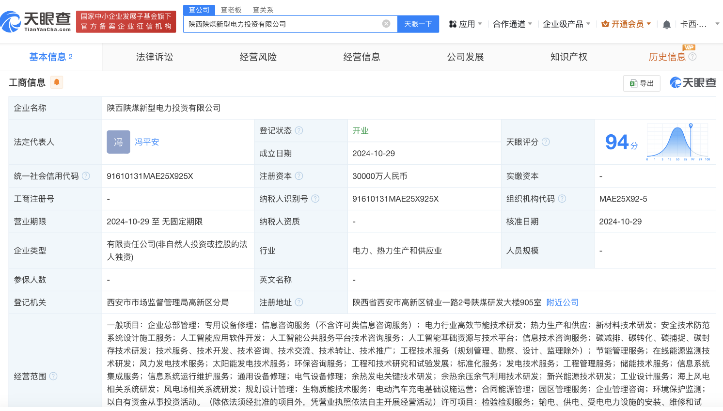 天眼查App显示,近日,陕西陕煤新型电力投资有限公司成立,法定代表人为冯平安,注册资本3亿人民币,经营范围含电力行业高效节能技术研发,热力生产和供应,碳减排、碳转化、碳捕捉、碳封存技术研发等。股东信息显示,该公司由陕西煤业化工集团有限责任公司全资持股。