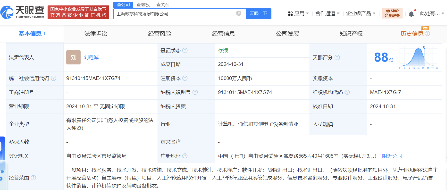 天眼查App显示,近日,上海歌尔科技发展有限公司成立,法定代表人为刘耀诚,注册资本1亿人民币,经营范围含人工智能应用软件开发、人工智能行业应用系统集成服务、信息技术咨询服务、专业设计服务、工业设计服务、电子产品销售等。股东信息显示,该公司由歌尔股份(002241)全资持股。