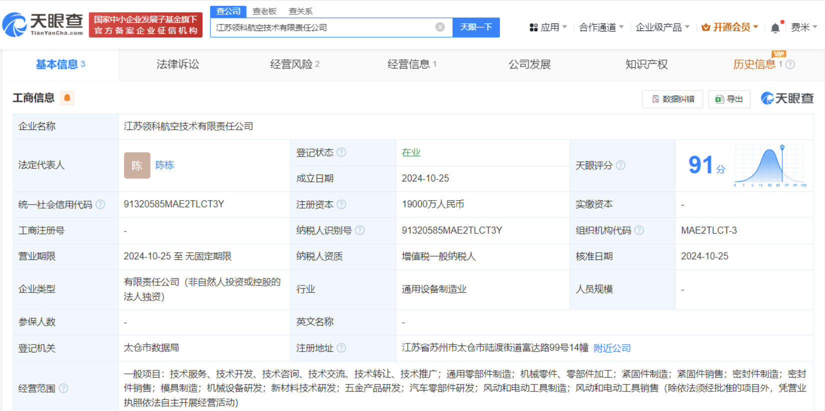 天眼查App显示,近日,江苏领科航空技术有限责任公司成立,法定代表人为陈栋,注册资本1.9亿人民币,经营范围含通用零部件制造、紧固件制造、密封件制造、模具制造、机械设备研发、新材料技术研发等。股东信息显示,该公司由中国航空工业标准件制造有限责任公司全资持股。