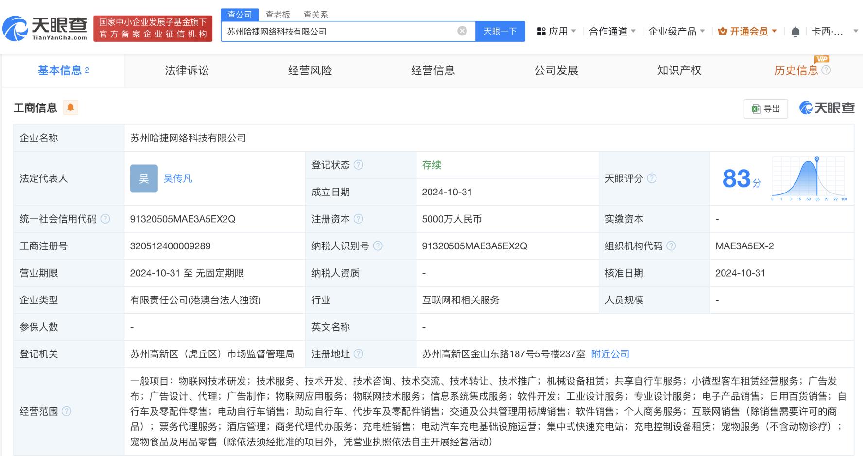 天眼查App显示,近日,苏州哈捷网络科技有限公司成立,法定代表人为吴传凡,注册资本5000万人民币,经营范围含物联网应用服务,电动自行车销售,助动自行车、代步车及零配件销售等。股东信息显示,该公司由哈啰出行旗下Hong Kong RideTech Limited全资持股。